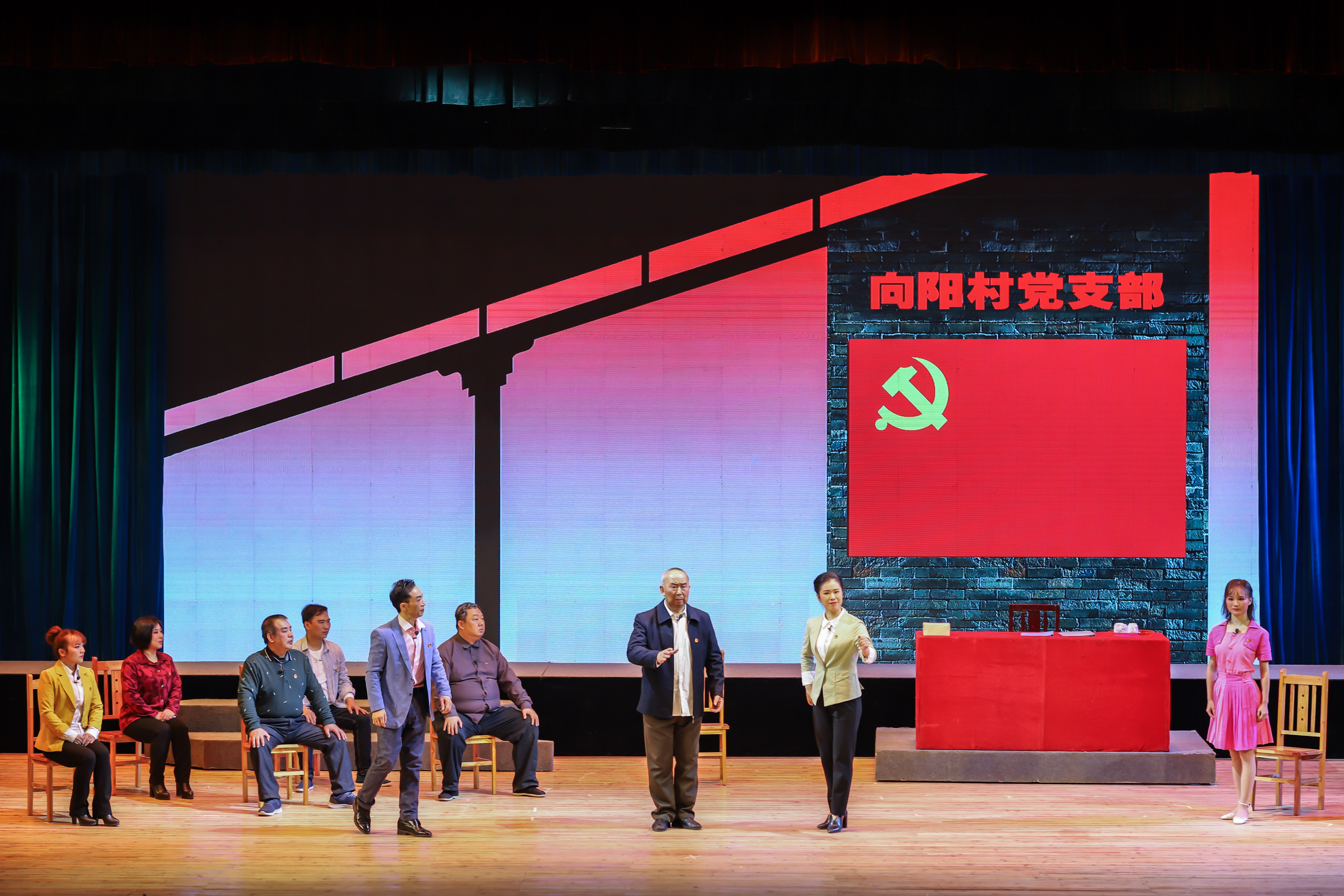 29日晚祁剧表演艺术家们为现场观众们带来了大型现代祁剧《向阳书记》。《向阳书记》以全国人大代表、基层村支书王在德和向平华为原型,用地方戏演绎了一个小山村脱贫攻坚的故事:在大城市当经理的向之远被选为村支书后,要创办一个零利润的服装厂,目的是让在外打工的村里人回家团聚并致富。因得不到待他恩重如山、一心为公的老支书的支持,加上小舅子的挑拨离间,一切努力都变得风雨飘摇……历尽艰辛,服装厂终于如愿开张,全村人开始众志成城。通过小人物展现大情怀,通过传统艺术展示现代文明,该剧传递出绿水青山就是金山银山的发展理念,也全景式反映了建设美丽乡村的宏伟画卷,细致刻画了基层支书为贯彻落实习近平总书记的系列指示精神而不懈奋斗的精神风貌。现场演出中,永州市祁阳祁剧团采用了失传已久的祁剧最原始的祁胡伴奏,独具特色。