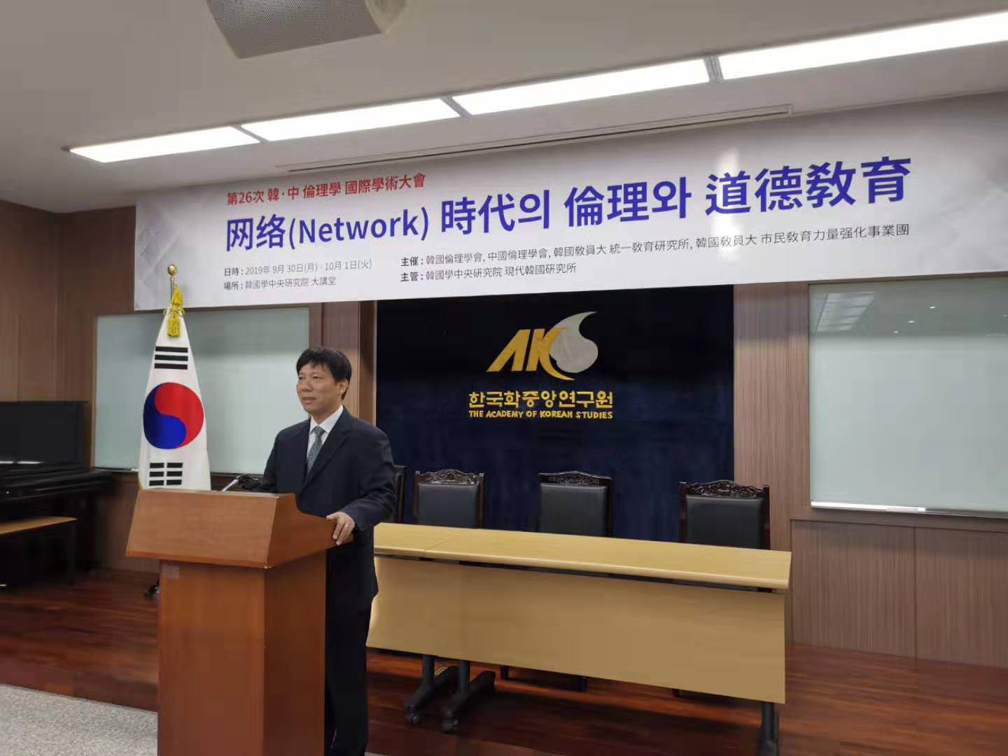 本网讯 近日由韩国伦理学会、中国伦理学会共同主办的第26次韩中伦理学国际学术大会在韩国举行,本次大会的主题是“网络时代的伦理和道德教育”,来自中国和韩国的108名伦理学研究者和道德教育工作者参加会议。永利官网潘剑锋教授应韩国伦理学会的邀请参加了此次会议,并作了题为“网络时代更需要加强孝道教育”的学术报告。他从传统孝道中的育人思想、传统孝道育人思想的育人作用、当今网络条件下加强孝道教育刻不容缓三方面阐明了为什么网络社会更需要加强传统孝道教育,受到了中韩学者的高度评价。