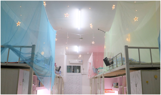 别具创意的装饰、整洁干净的环境、温馨和谐的氛围,该院各寝室团结协作,打造了一个又一个特色寝室。有的将自己的照片贴在墙上作为装饰,有的用手工折纸做成小饰品,有的用气球装扮天花板,风格各异。其中,荷二303寝室以温馨淡雅为主题,打造了可爱俏皮的气球天花板,在暖黄色的墙上贴上山形的贴纸,勉励自己要像山一样坚韧挺拔。荷二208寝室“绿萝苑”以蓝色为主色调,寓意室友们要像海洋天空一样宽广,相互包容、和睦共处。