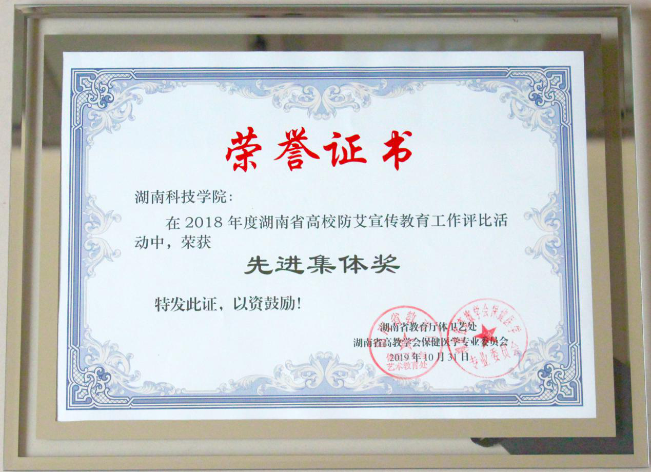 本网讯 10月31日,由湖南省高校保健医学专业委员会主办的湖南省高校保健医学会2019年年会在长沙卫生职业学院召开,会上颁发了2018年度湖南省高校防艾宣传教育工作评比活动有关奖项,永利官网荣获“先进集体奖”。