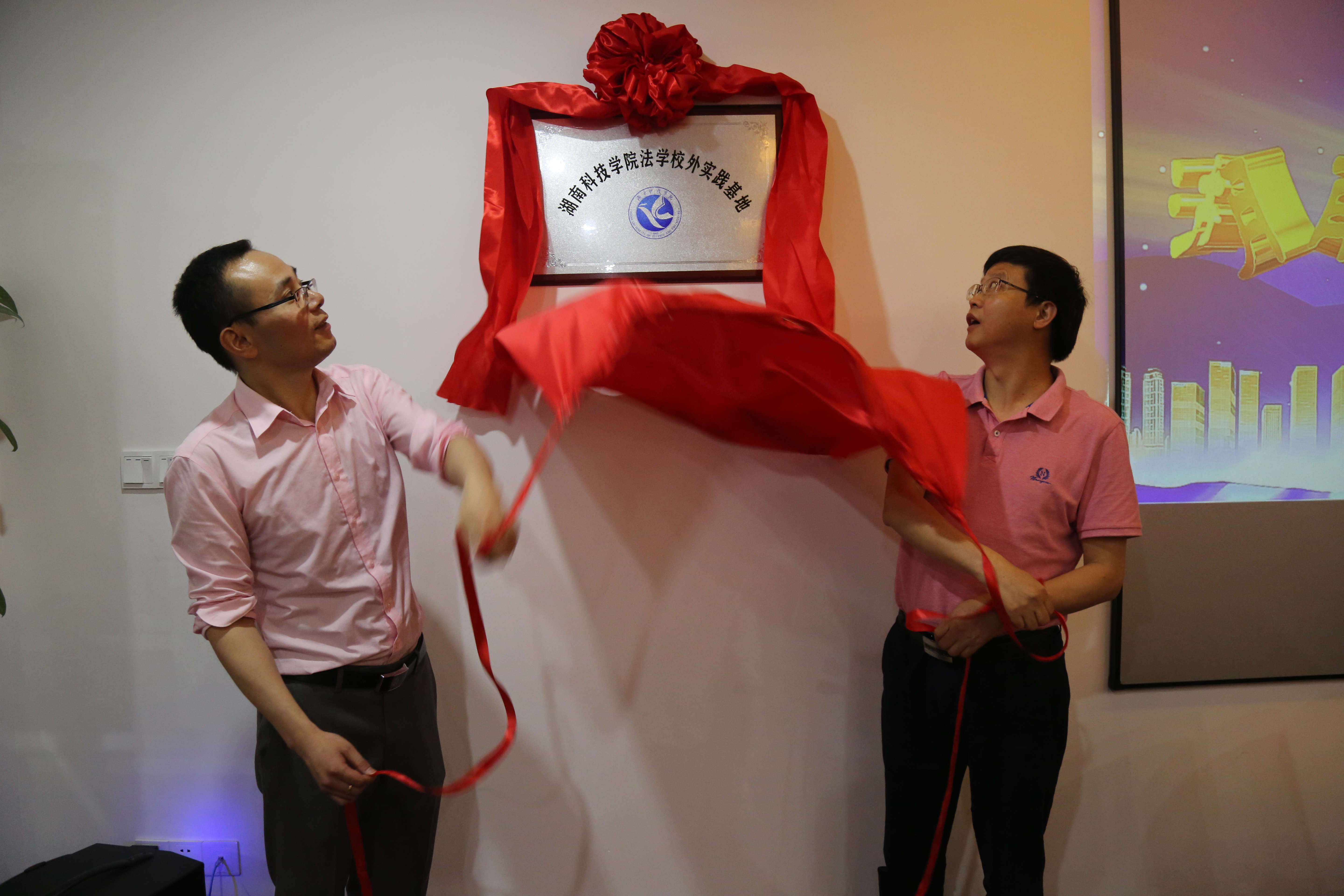 本网讯 6月10日上午,304am永利集团官网法学专业校外实践基地揭牌仪式在湖南弘一(永州)律师事务所举行。湖南弘一律师事务所管理委员会主任周群翔、湖南弘一(永州)律师事务所主任刘志军,人文与社会科学学院院长潘雁飞、党总支书记谷显明共同为基地揭牌。