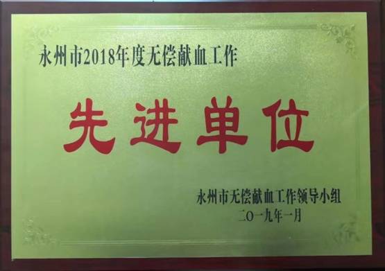 本网讯 近日,从永州市无偿献血工作领导小组传来喜讯,永利官网在2018年度无偿献血活动中,工作突出,荣获永州市“无偿献血先进单位”。