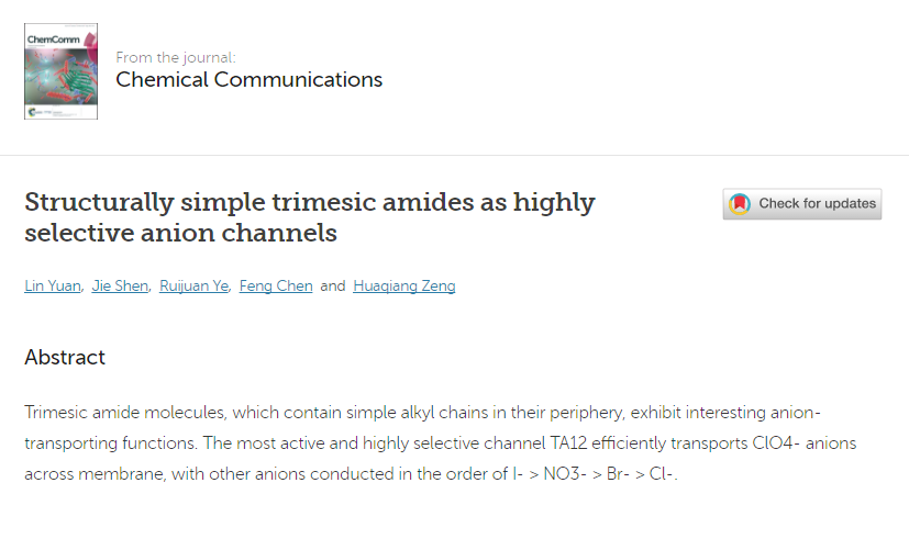 本网讯 近日,化学与生物工程学院袁霖博士以第一作者身份报道了一种结构简单的高选择性阴离子通道,这一成果发表在英国皇家化学会主办的高端SCI学术期刊Chemical Communications(影响因子6.29,中科院分区大类一区)上。