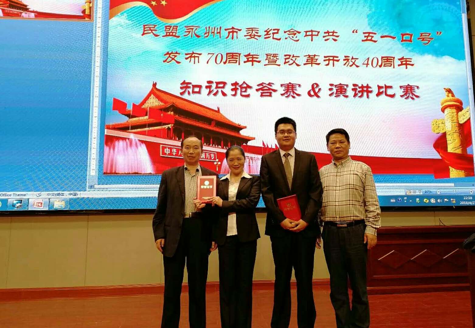 本网讯 4月27日,民盟永州市委举行纪念中共“五一口号”发布70周年暨改革开放40周年系列活动之知识抢答赛和演讲比赛,永利官网民盟支部参加了比赛,永州市委常委统战部部长石艳萍、民盟永州市委主委袁火林到场观看。