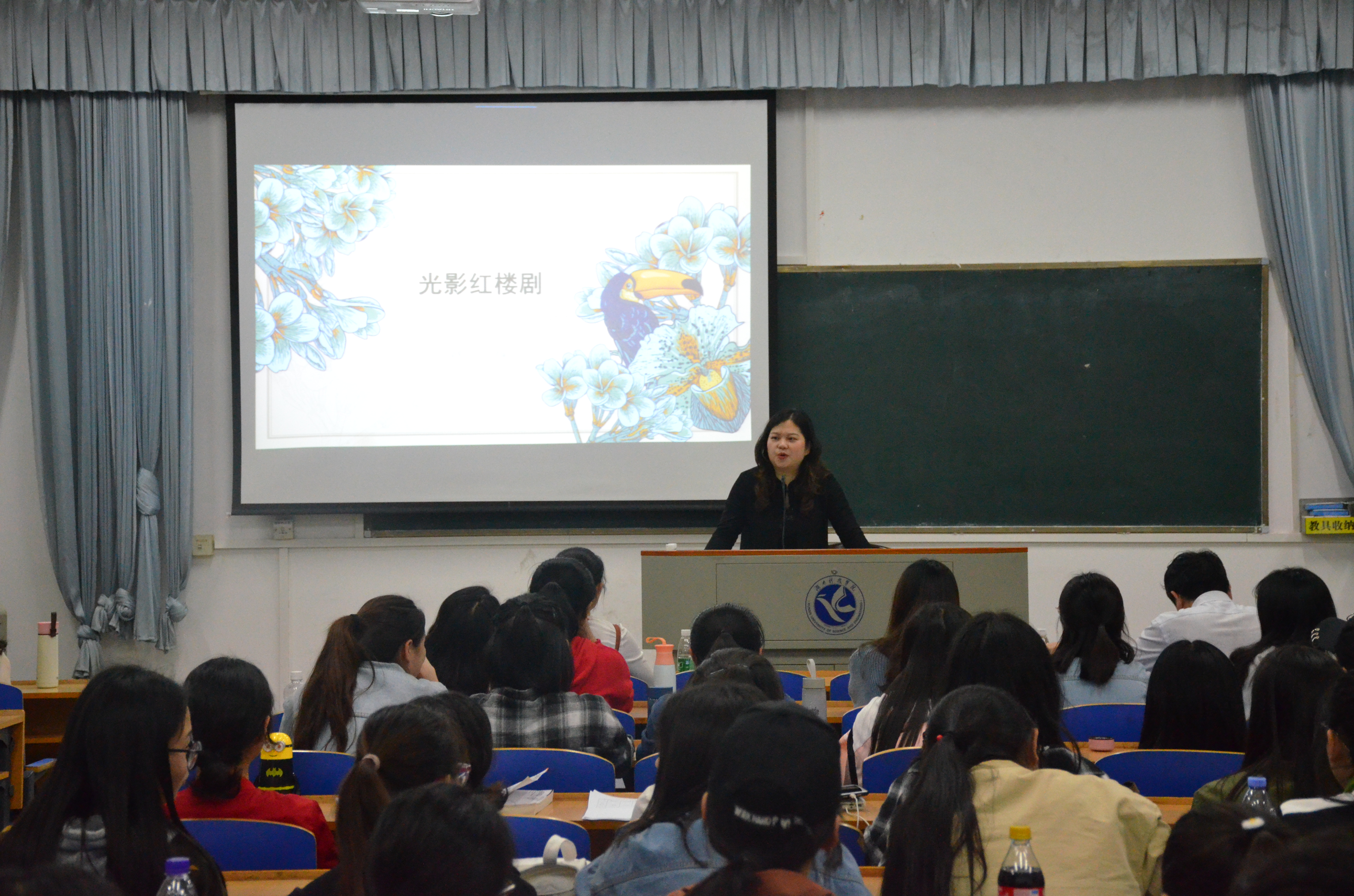本网讯 3月27日晚,中国影视高教协会会员、湖南师范大学高欢欢博士应邀来校开展《红楼剧的悲剧意蕴探究》学术讲座,该院16、17级戏剧影视文学专业全体师生聆听了讲座。
