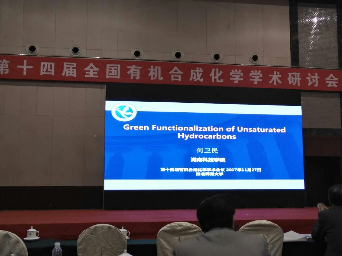 本网讯 10月26日,由中国化学学会和国家自然科学基金委主办,淮北师范大学承办的第十四届全国有机合成化学学术研讨会在安徽淮北举行,化学与生物工程学院教师何卫民副教授参加了研讨会,并在大会第一天以“Green Functionalization of Unsaturated Hydrocarbons”为题做学术报告。