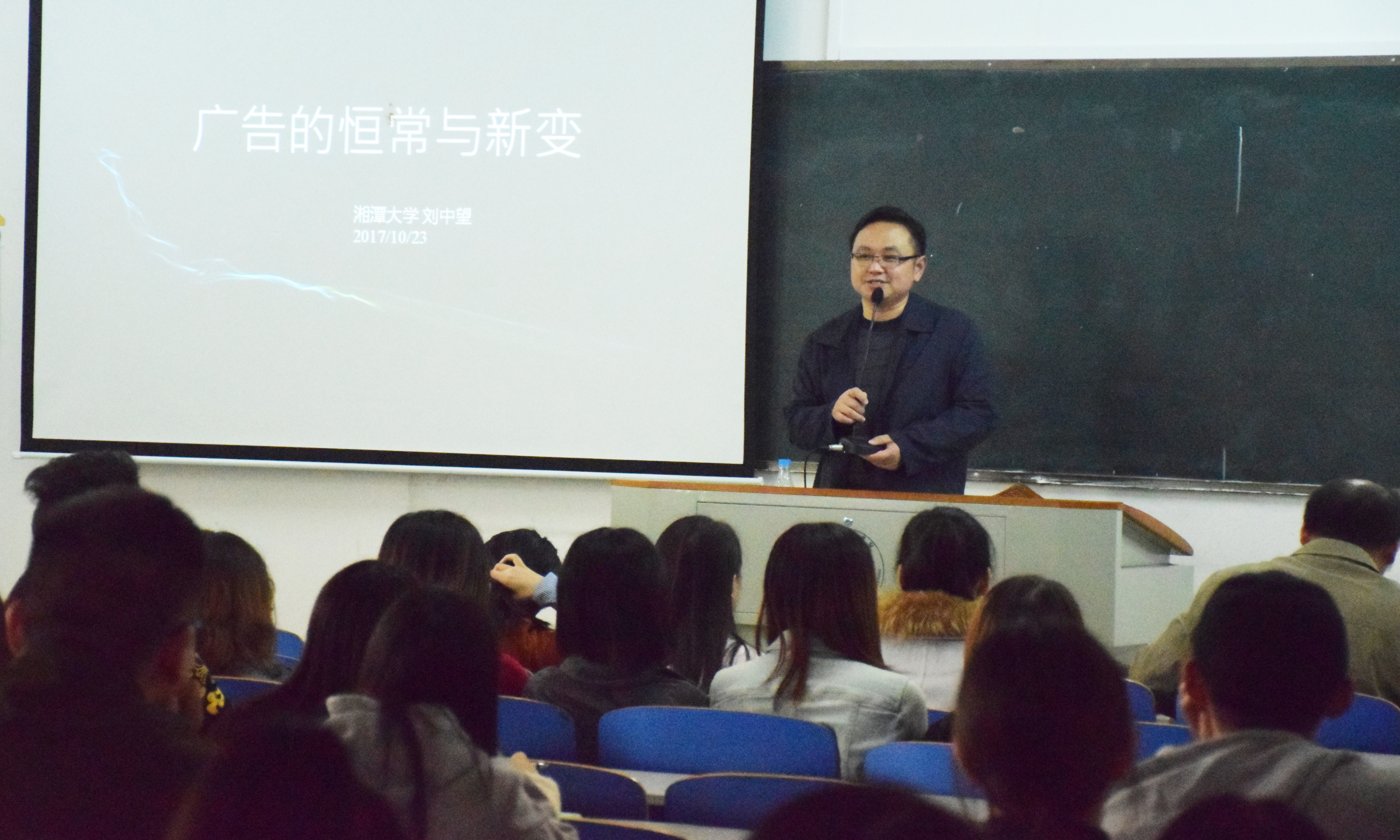 本网讯 10月22日,湘潭大学博士生导师刘中望教授应邀来永利官网为传媒学院师生作题为《广告与前沿》主题讲座,传媒学院广告专业师生聆听了讲座,传媒学院院长杨增和主持讲座。