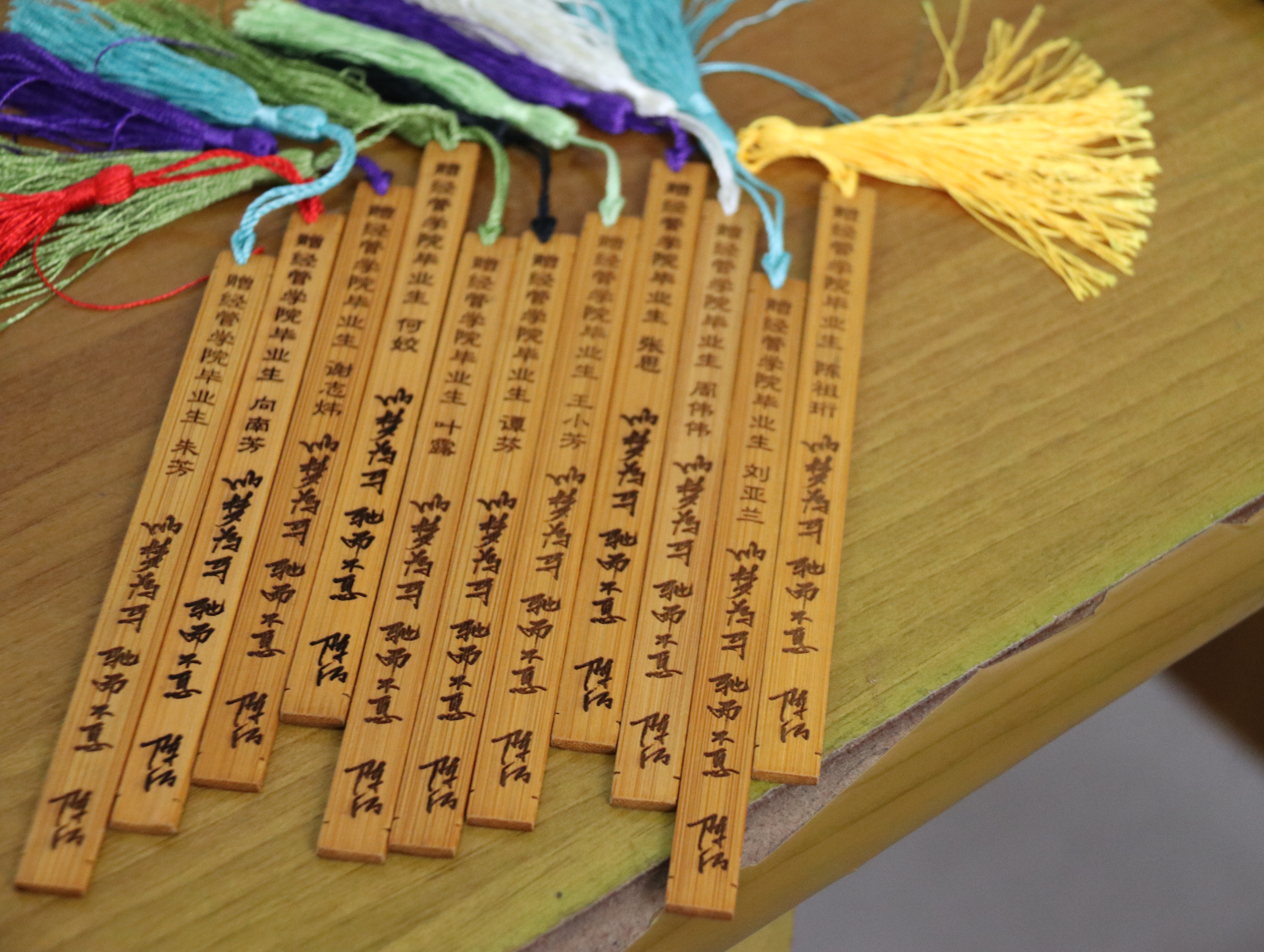 书签是木制长条形,一面刻有每一名毕业生的名字以及校党委书记陈弘书记“以梦为马,驰而不息”的寄语,希望每一位毕业生都能够怀着自己的梦想,永不停歇的愿望;另一面刻着304am永利集团官网的校徽和“德才兼备,自强不息”的校训,同时还刻有竹叶,寓意着挺拔洒脱、正直清高的品质。