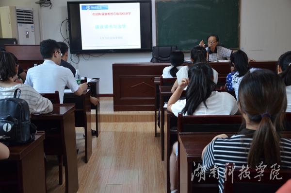 本网讯(通讯员 唐议侦 王佩莹)6月22日,人文与社会科学学院邀请湖南师范大学教授、省优秀社会科学专家陈蒲清在明德楼404会议室开展以“读书与治学”为题的讲座,该院全体师生聆听讲座。