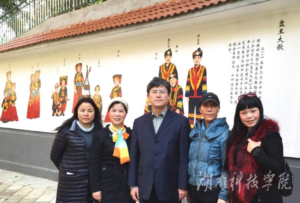 交流双方在《盘王大歌》艺术墙前合影留念,右二为加籍华人李建红女士