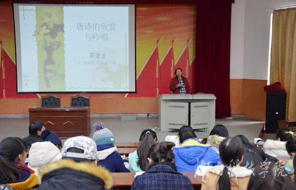 本网讯(通讯员 袁玲玲 李雯静)12月21日下午,在明德楼报告厅,人文与社会科学学院邀请广西师范大学博士生导师莫道才教授作以“唐诗的欣赏与吟唱”为题的讲座。该院院长潘雁飞教授以及部分教师代表参加讲座。