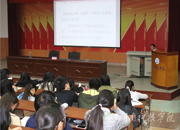 潘雁飞介绍学科与专业的关系,专业是学科承担人才培养职能的基地;学科是专业发展的基础。他指出,汉语言文学专业最早可追溯到京师大学堂的中国文学门,其建立标志中国语言文学成为一门现代的独立学科。他强调,汉语言文学专业应“守正”,即重在培养学生的人文素养、道德情怀;但也要“创新”,即在全媒体社会背景下以新的传播方式和多样的表达方式丰富汉语言文学的专业内涵。他向同学们讲解该院汉语言文学专业的办学特色,即拟采用复合型、创新型、个性化的人才培养机制,形式多样的专业教学模式,以及特色的梯级实践教学链,实现学生专业能力过关的目标。