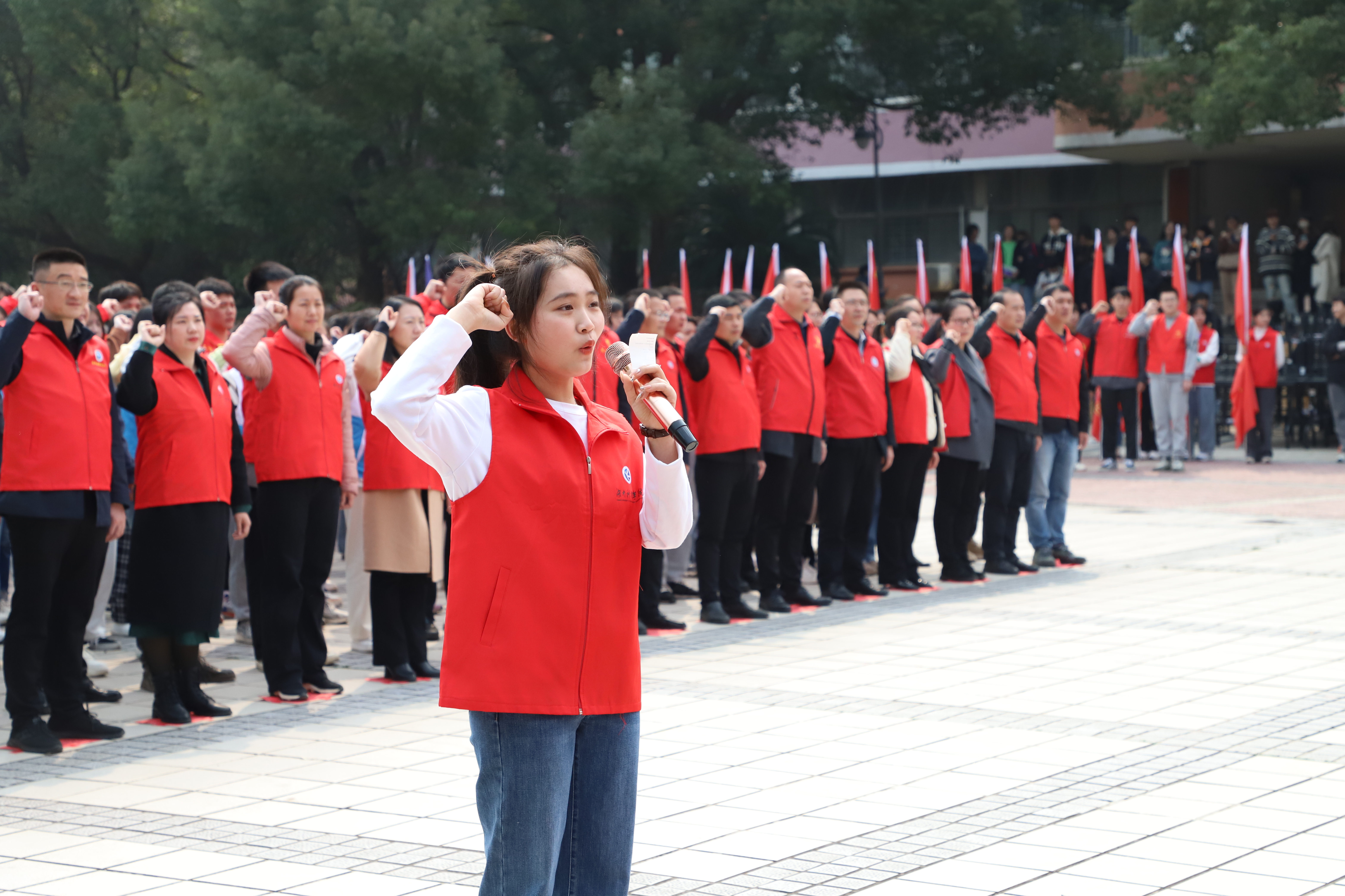 校领导为各学院志愿服务队授旗,各学院学生代表身着专业特色的志愿服在广场上用力挥舞着学院志愿服务旗帜,飘扬的青年志愿旗帜在空中汇聚成了一片奉献、友爱、互助、进步的志愿红。