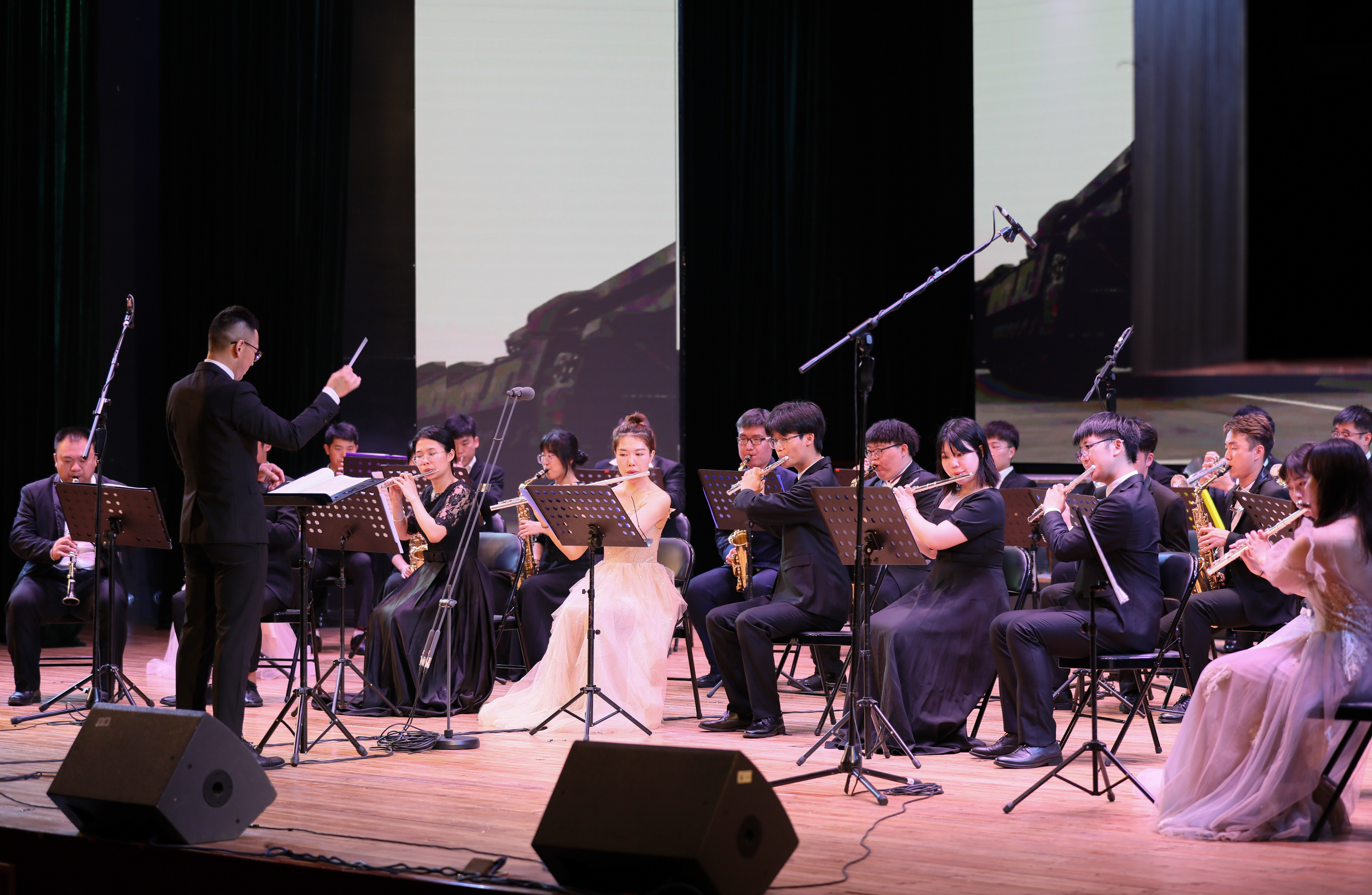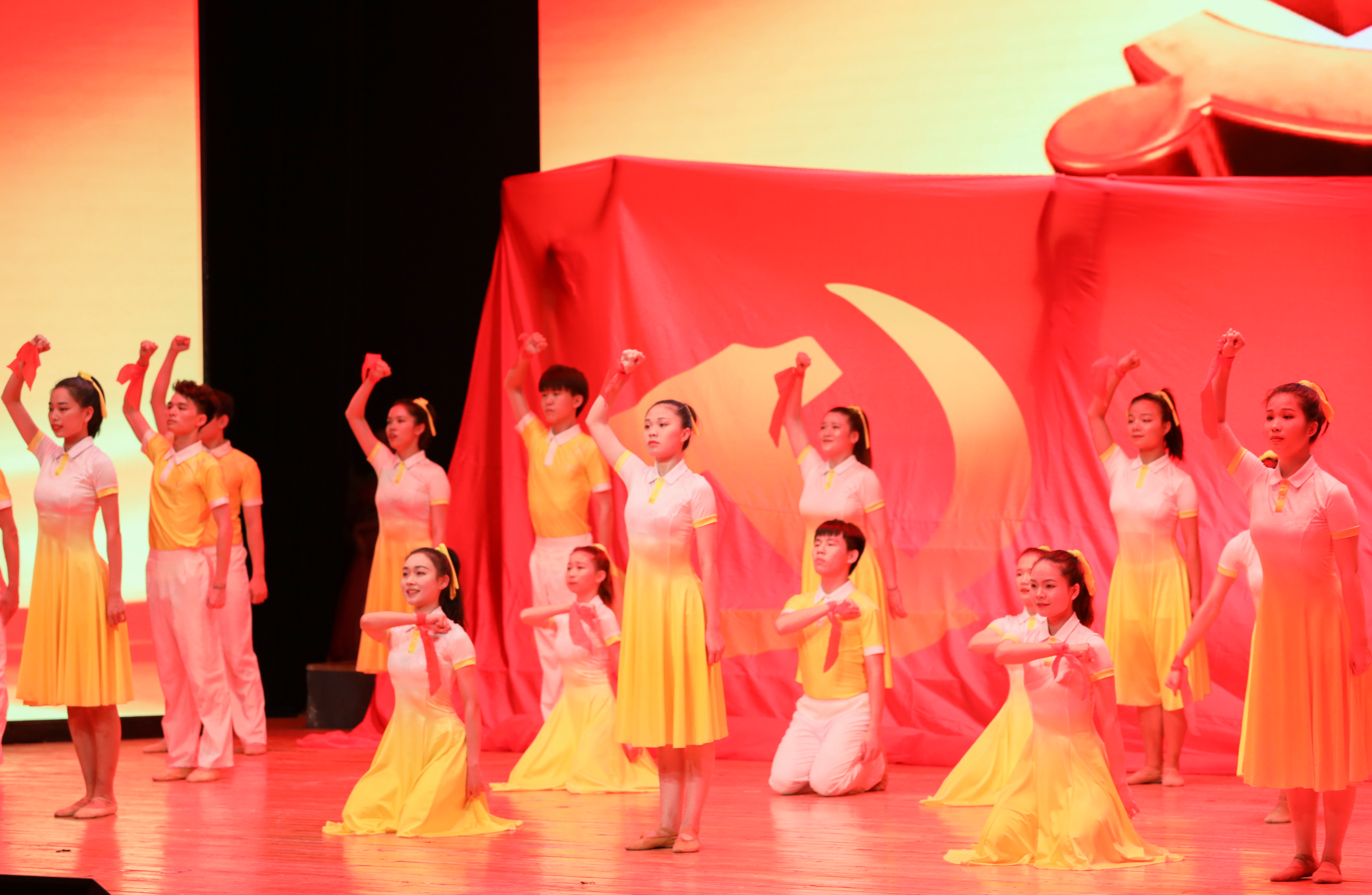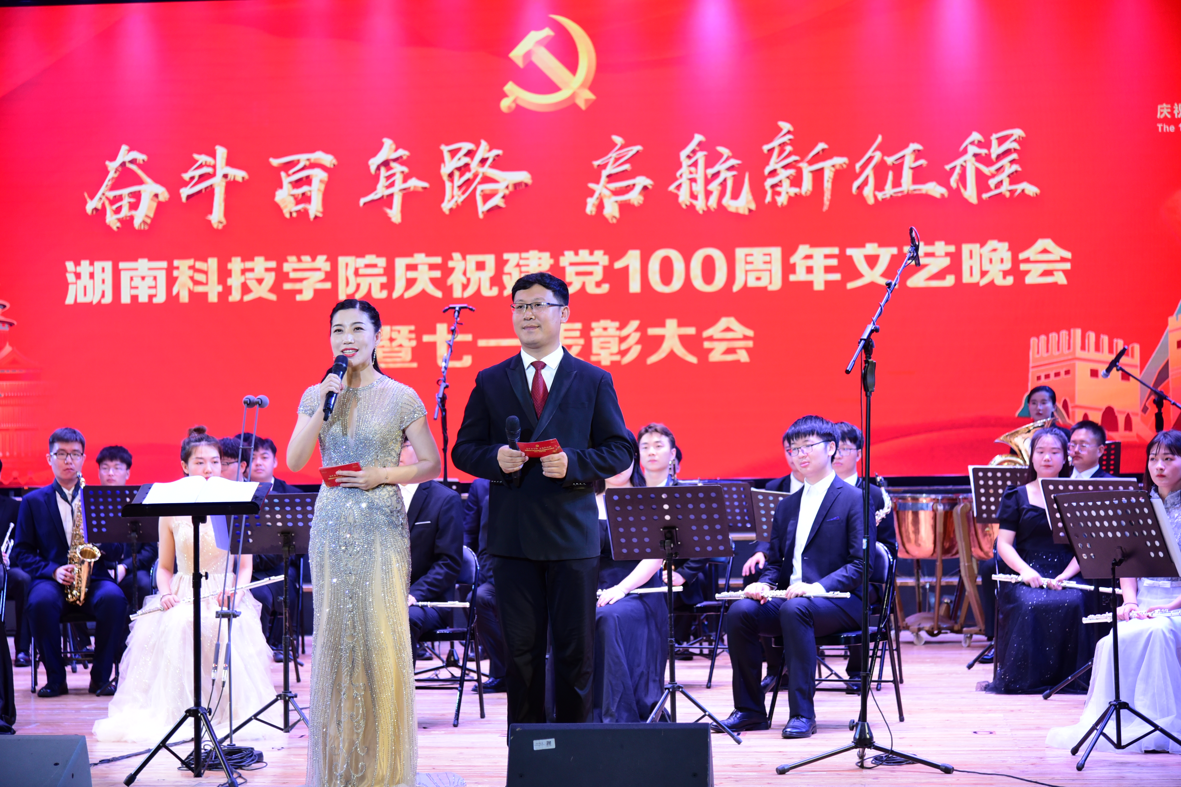 会场内一派庄严肃穆,党旗飘扬,红色旋律响亮。暖场环节,由音乐与舞蹈学院交响管乐团演绎的《钢铁洪流》《没有共产党就没有新中国》曲声悠扬,带领在场师生仿佛回到了百年之前,重温了共产党人的初心与使命。