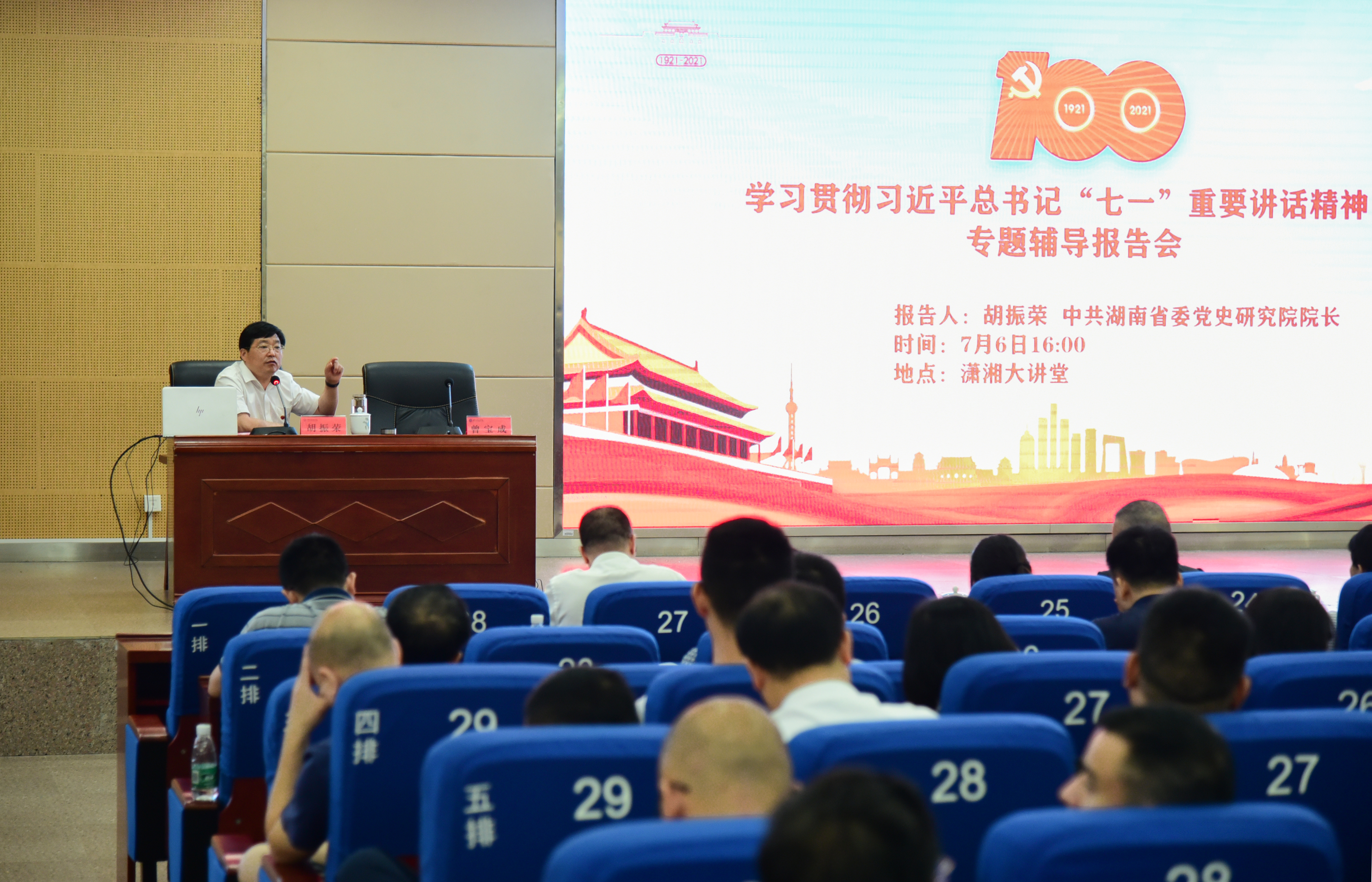本网讯 7月6日下午,学校举行学习贯彻习近平总书记“七一”重要讲话精神专题辅导报告会。中共湖南省委党史研究院院长胡振荣应邀来校作专题辅导。省委党史研究院综合部主任、一级调研员刘文典,市委党史研究室主任李祥红,新田县委副书记易先平,在家校领导及师生党员代表600余人聆听专题辅导报告。校党委书记曾宝成主持报告会。