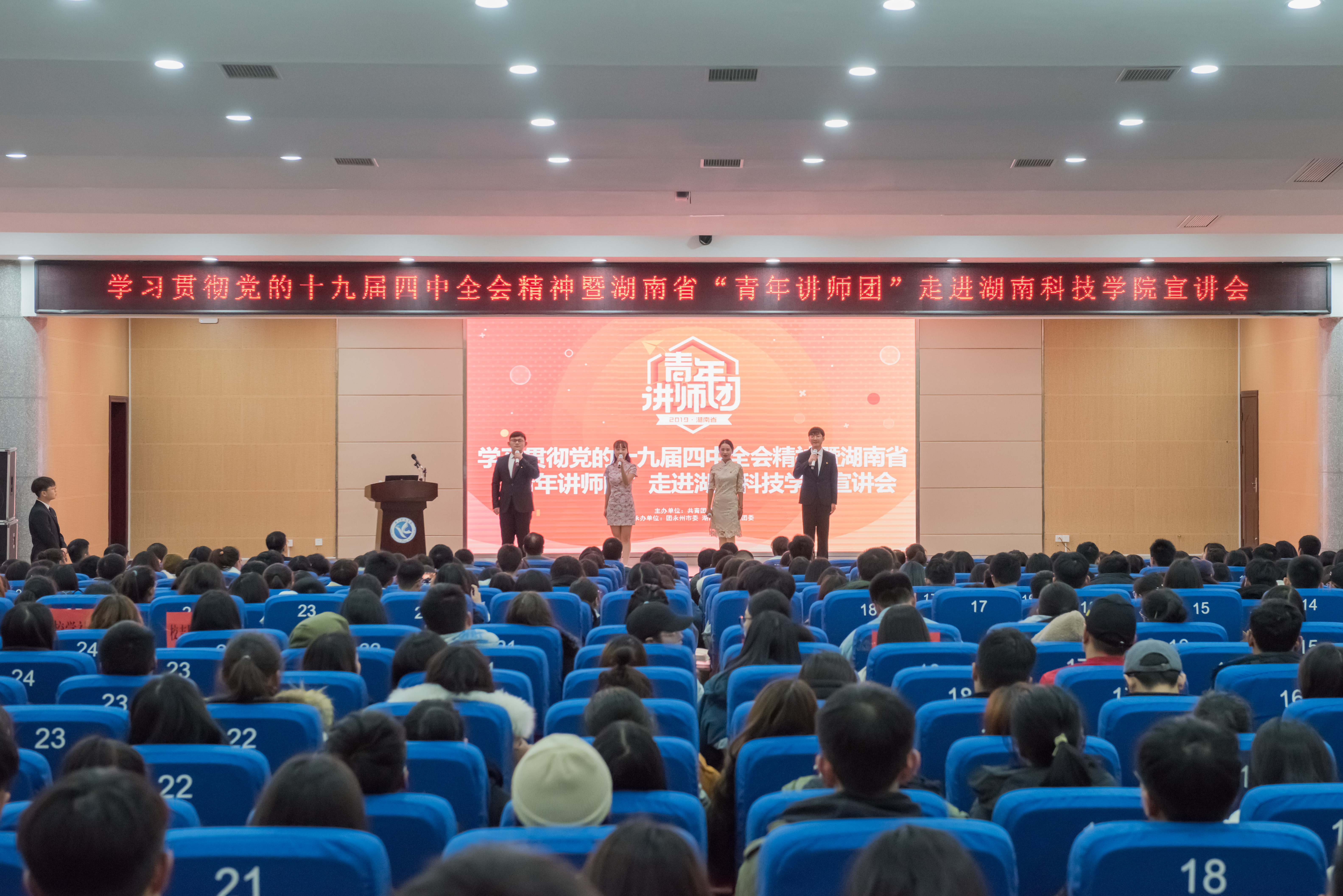 本网讯 12月19日晚,湖南省“青年讲师团”走进永利官网宣讲十九届四中全会精神。青年讲师们围绕学习贯彻党的十九届四中全会精神,结合自身工作实际,以自己的亲身经历和真情实感,生动讲述祖国发展成就故事和青年追梦奋斗故事,学校800余名师生代表现场聆听。
