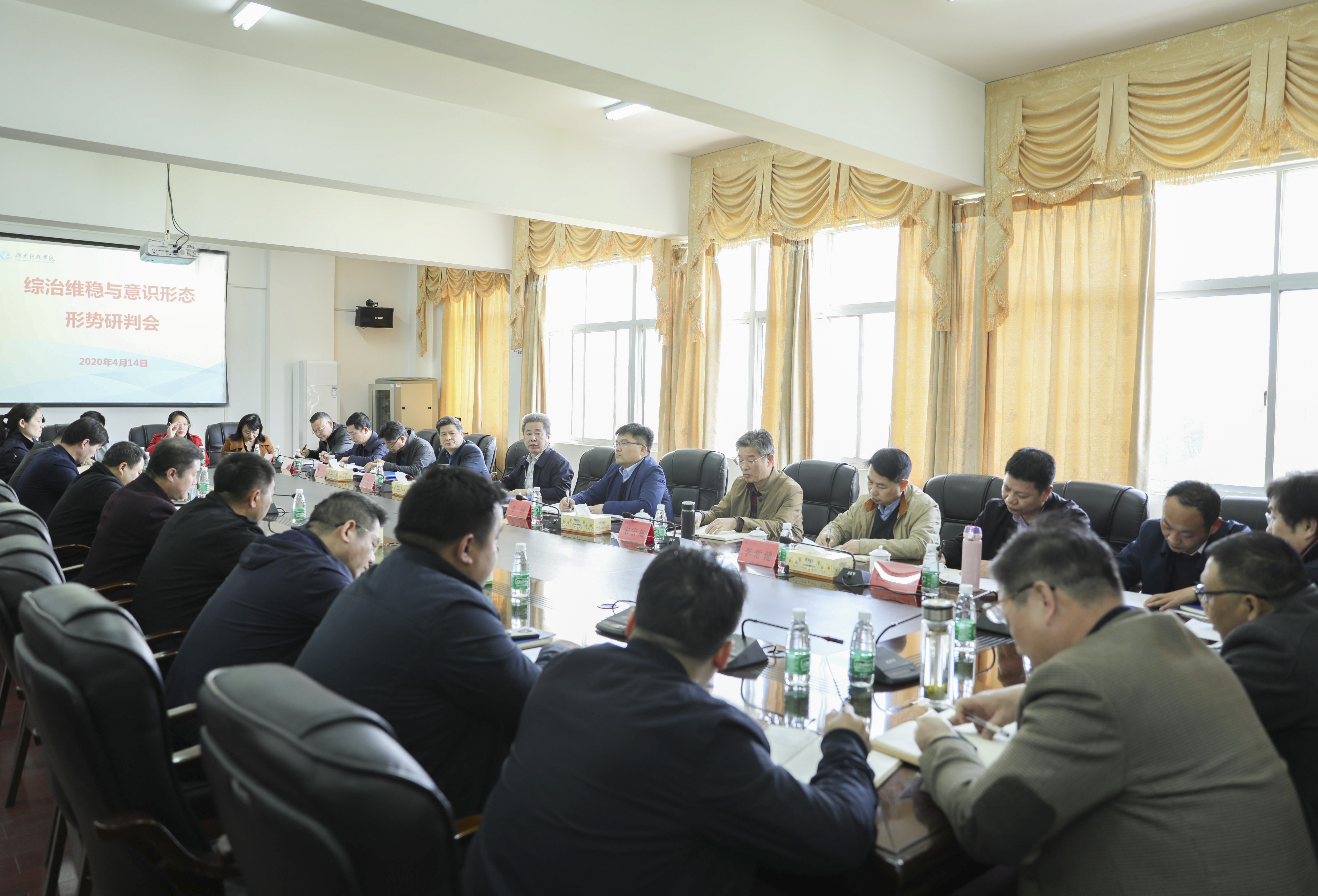 本网讯 4月14日下午,学校举行综治维稳与意识形态形势研判会。校党委书记曾宝成,校长李钢,校领导唐艳明、宋宏福、彭立威、李常健、吴小林、程智开,党委委员、组织部长何福林,党委委员、宣传统战部长杨涛出席会议,会议由曾宝成主持。