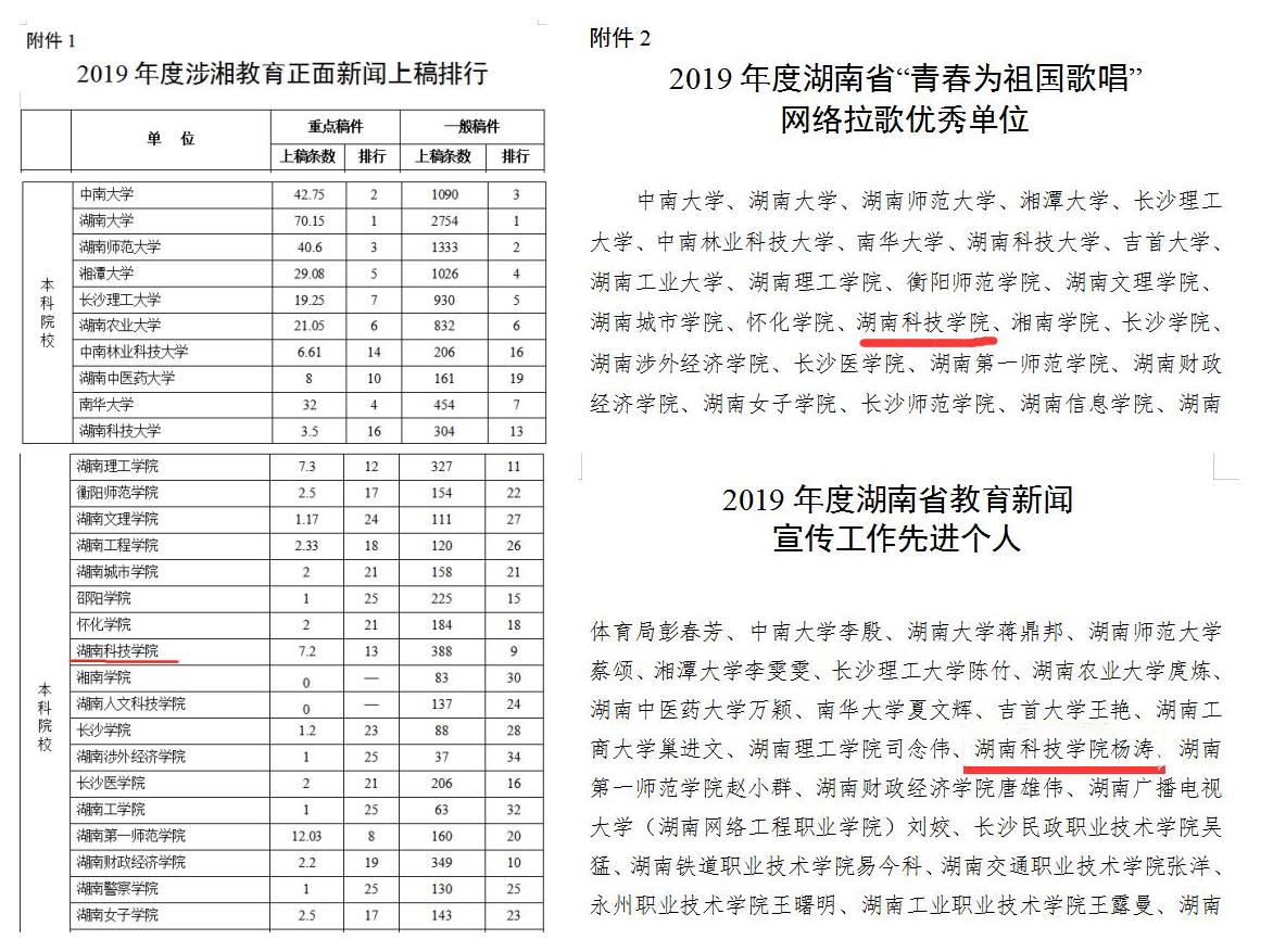 本网讯 近日,从湖南省教育厅下发的《关于2019年度全省教育新闻宣传工作情况的通报》(湘教通【2020】82号)中获悉,永利官网2019年度涉湘教育正面新闻重点稿件上稿7.2篇,一般稿件上稿388篇,重点稿件和一般稿件在全省同类院校中均位列第一。学校获得2019年度湖南省“青春为祖国歌唱”网络拉歌优秀单位,杨涛同志荣获2019年度湖南省教育新闻宣传工作先进个人。