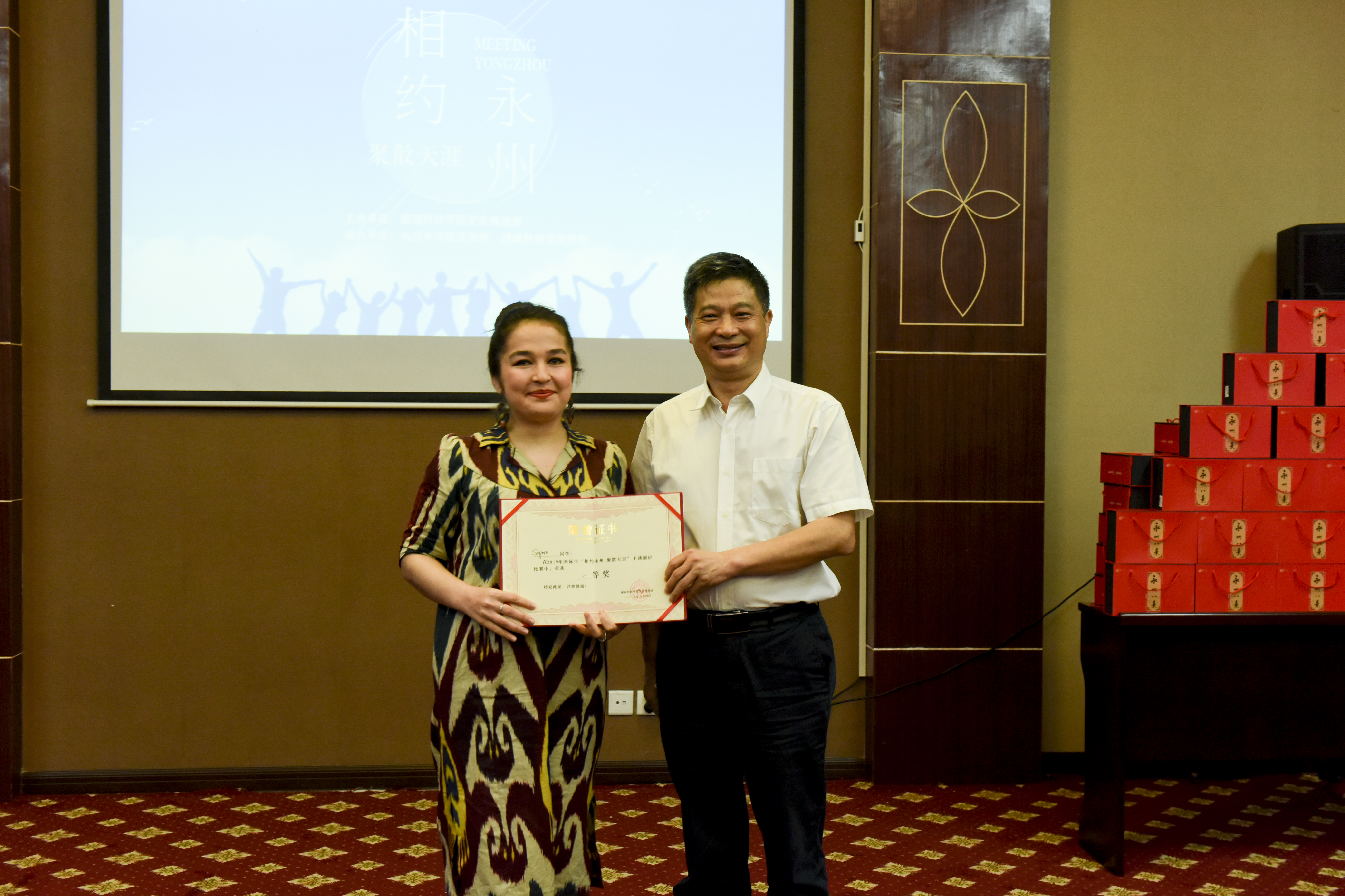 演讲比赛以"相约永州 聚散天涯"为主题,10名国际生结合在永州的学习和生活经历,采用载歌载舞或说唱结合的形式,诉说他们对永州文化、师生情谊的美好回忆,畅聊在学校的学习收获,抒发各自对留学生活的依依惜别之情,表达对美丽中国、热情中国人民的喜爱。