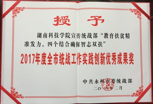 2月27日,中共永州市委将纪委、党办、组织、宣传、统战、政法等党务部门的工作会议合并召开。市委书记、市人大常委会主任李晖出席并讲话,市委副书记、市长赵应云主持会议,市委副书记、市委政法委书记唐湘林宣读表彰通报。永利官网荣获2017年度全市统战工作先进单位称号,全市统战工作首次纳入市委考核,永利官网首次获此殊荣。下午,全市统战部长会议在南华大酒店召开。永利官网宣传统战部“教育扶贫进准发力,四个结合确保智志双扶”获2017年度全市统战工作实践创新优秀成果奖。