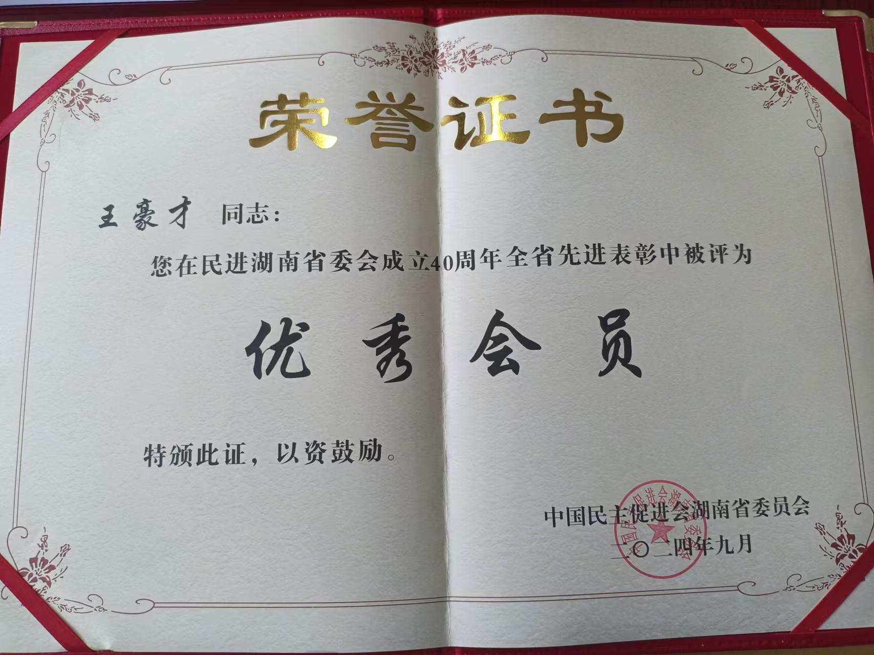 本网讯(通讯员 李焕品)9月4日,在长沙召开的民进湖南省委会成立40周年庆祝大会上,永利官网教师、民进会员王豪才荣获表彰,被评为“优秀会员”。全国人大常委会副委员长、民进中央主席蔡达峰出席庆祝大会,并向获奖者代表颁奖。