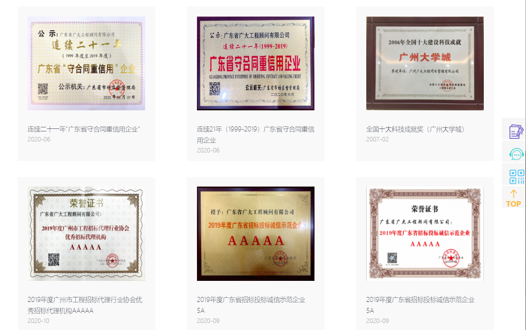 | 广东省广大工程顾问有限公司 广东省广大工程顾问有限公司(以下简称广大公司),始建于1994年,是广东省建筑业协会副会长单位、广州市建设监理行业协会副会长单位、广东省建设监理协会理事单位、番禺区建筑业协会常务理事单位,曾被广东建设监理协会指定为监理工程师培训班的教学及管理机构,被誉为华南地区“监理工程师的摇篮”。成立二十几年来,广大公司为珠三角地区乃至全国各地的客户提供了优质的全过程咨询、项目管理、项目顾问、项目咨询、项目代建、工程监理、工程招标代理、造价咨询、政府采购等服务。长期与各级政府机关、军队系统、医疗系统、国内大型地产企业等保持亲密合作关系。承接工程监理项目几千项、招标代理项目几万项,业务范围涵盖:市政、房建、水利、交通等行业。广大公司勇于创新,采用BIM技术应用与项目监理有机融合,承接BIM技术项目上百项,为项目建设提供更加有效的管理手段和管理方法。 公司各项业务工作与技术均获得行业各界的高度认可,由公司承接的工程监理项目先后荣获省级以上奖项几十项。企业招标代理在行业名列前茅,并已获得多个国家级及省级荣誉奖项。BIM技术应用获得第五届国际BIM大奖赛的“最佳医院BIM应用奖”、“BIM技术综合二等奖”等荣誉奖项,公司连续20年被广州市工商行政管理局授予“广东省守合同重信用企业”单位荣誉称号。