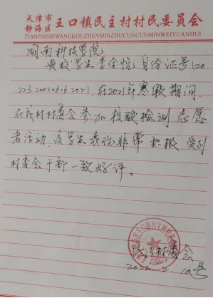 李金悦,工程管理2002班学生,在家乡玉口镇村委会担任核酸检测志愿者,他每天早早的到岗备战,服从安排,受到当地村委会干部一致好评。