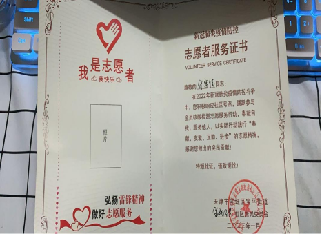宋宇佳,工程管理2001班学生,积极响应社区号召,在家乡宝坻区宝平街道参与全员核酸检测志愿服务行动,风雪无阻,尽职尽责,毫无怨言,用行动完满完成此次志愿活动。
