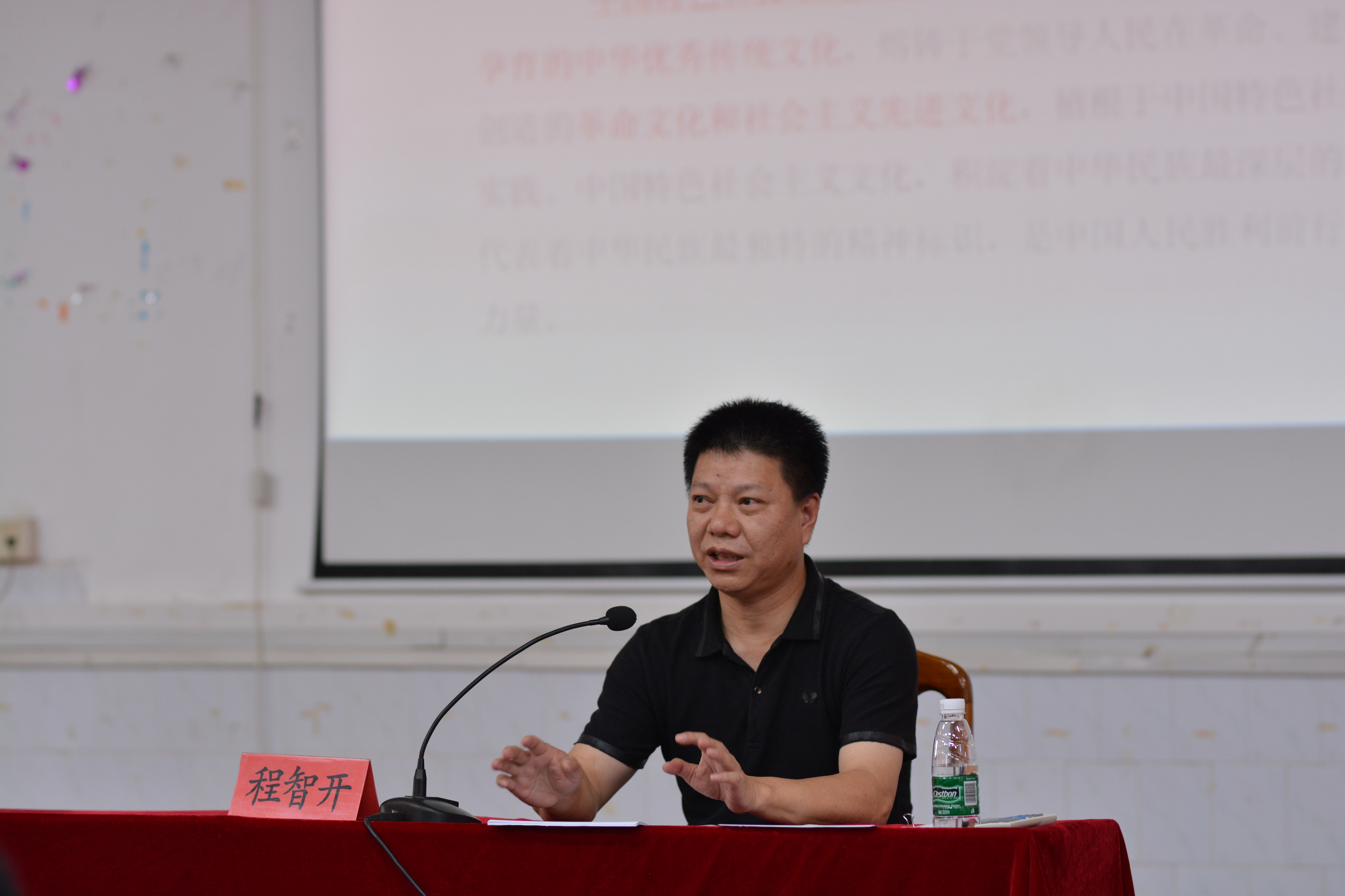 在题为《坚定中国特色社会主义“四个自信”》的党课中,程智开从提出过程、主要内容、辩证关系三个方面深入阐释了“四个自信”的科学内涵;指出“四个自信”的主要依据来自先进理论指导、成功实践证明和中国特色社会主义的优势与贡献。程智开指出,我们应该在学习研究中实现“四个自信”,在比较鉴别中坚定“四个自信”,在创新实践中提升“四个自信”。