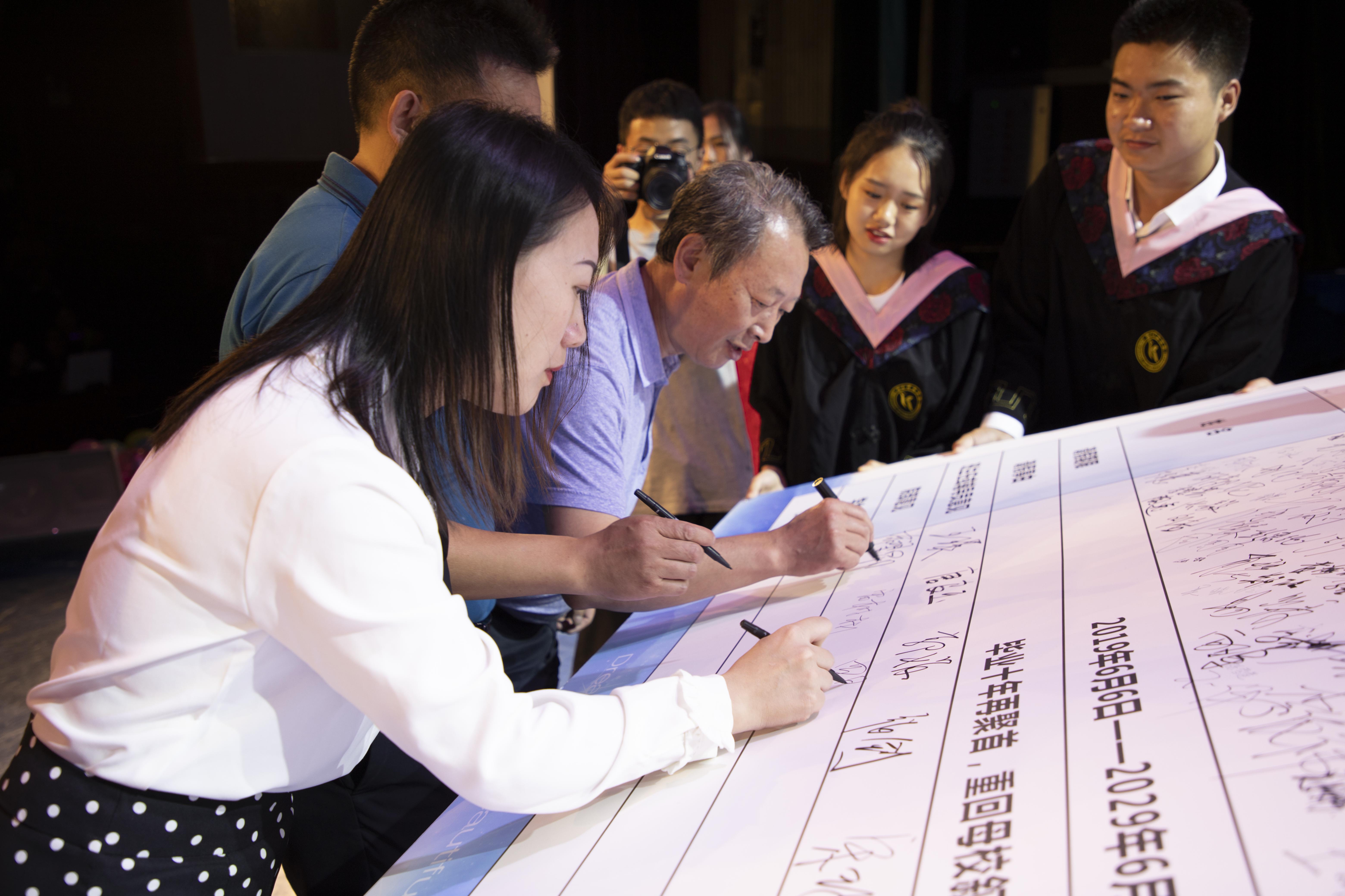 最后,领导、老师们为毕业生签批了一张期限为十年的“请假条”。毕业十年再聚首,重回母校叙情谊。