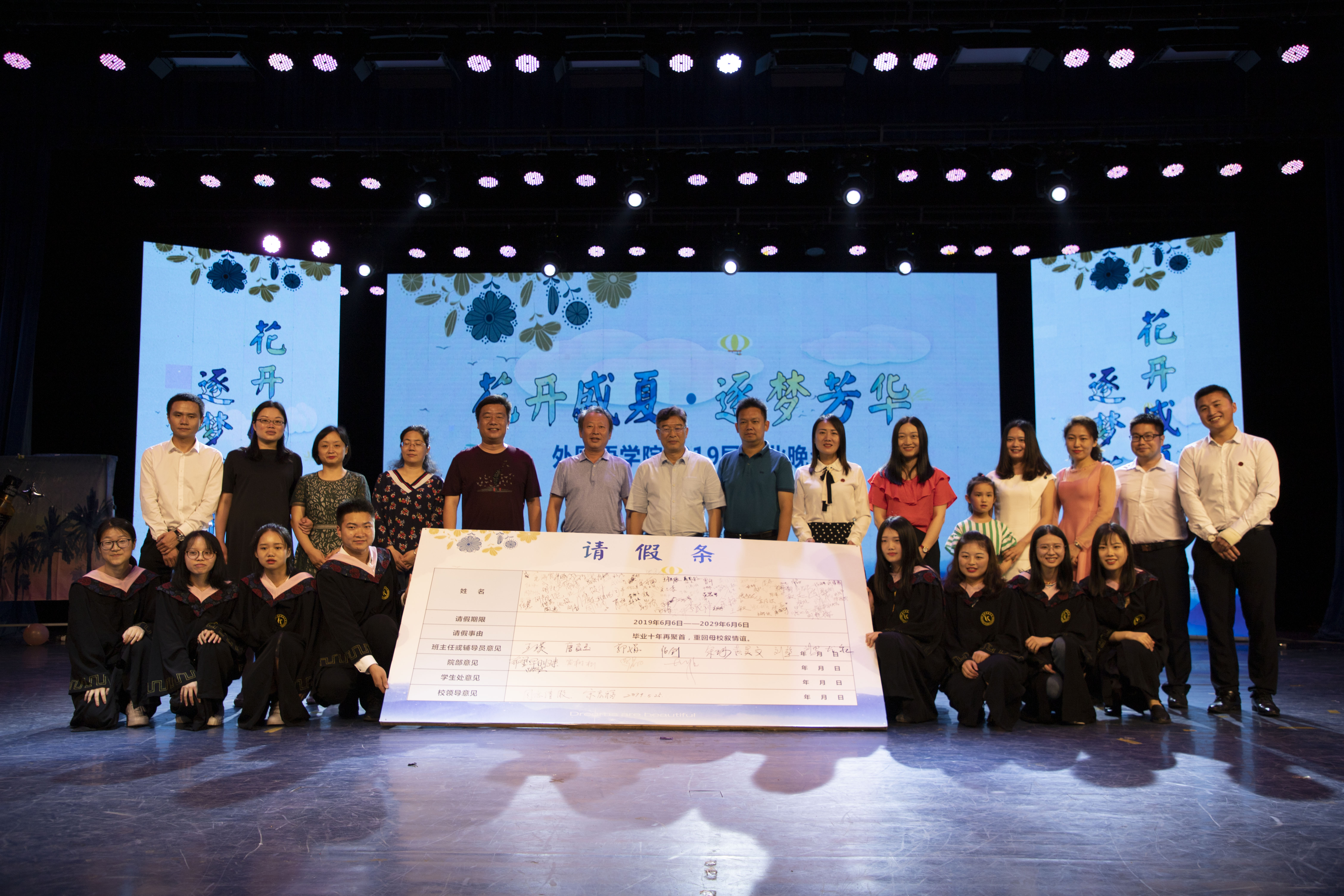 本网讯(通讯员 杜俊杰 张露)5月25日,外国语学院“花开盛夏,逐梦芳华”2019届毕业晚会在永利官网音乐厅隆重举行。校党委委员、副校长宋宏福到场观看晚会并为毕业生签批“请假条”。