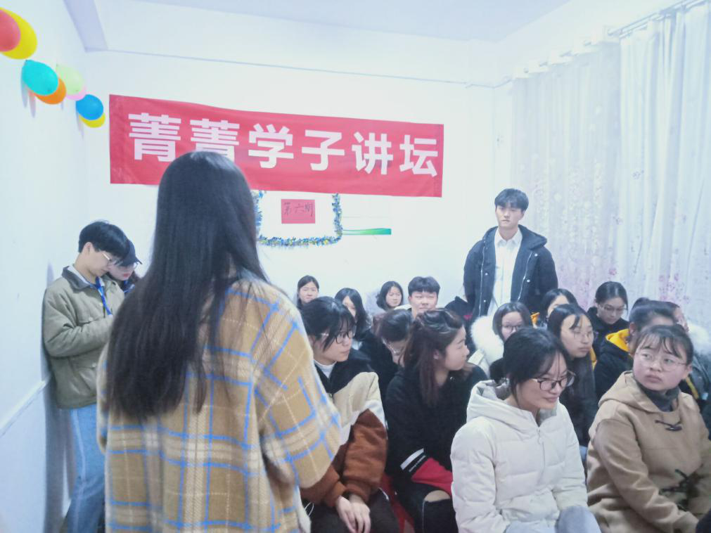 本网讯(通讯员胡雅洁 文慧)12月21日晚,菁菁学子讲坛第六期在菁菁书院如期举行。学工办副主任兼分团委书记刘罗老师,各班代表参加本次活动。本期菁菁学子讲坛的主讲人是可爱和美丽双商爆表的彭婕学姐,主题为“不忘初心,砥砺前行”。首先,彭婕向到场的同学们提出了在现阶段有没有树立小目标的问题,紧接着向大家分享了自己的一些生活学习经验,以自己为实例鼓励大家朝着目标奋斗前行不要放弃。她还提出了要在工作中学习、和室友处理好关系以及多参加课外活动扩充视野的一些建议,同学们受益匪浅。