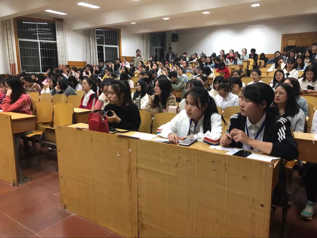在播放了国家资助宣传视频后,主持人介绍了赛事规则。首先上场的是英师1803班的参赛人员,她们的作品独具特色,大受观众好评。商英1801班、1802班的选手的作品中都蕴含了对国家的美好祝愿。日语1802班的作品立意十分独特。中场休息时,音舞院的田竞带来的歌曲《水姑娘》惊艳全场。歌曲结束后,英师1802班、日语1801班、英师1801班和英师1804班的的代表分别上台讲解了他们的作品。