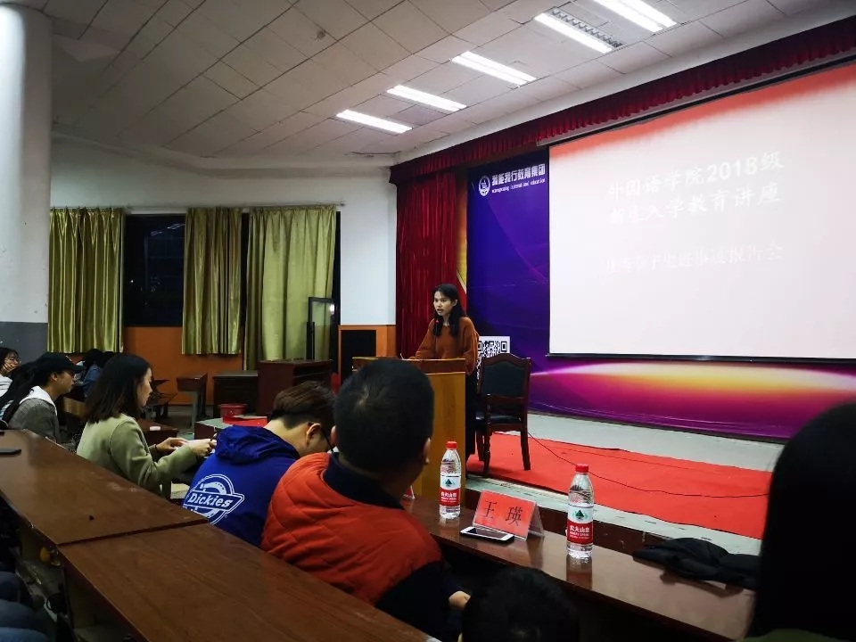 本网讯(通讯员 郑云华 张又尹)为了帮助新生了解大学学习特点,合理规划大学生活,2018年10月21日晚7点,外国语学院“2018级新生入学讲座--优秀学子先进报告会”在永利官网明德楼一楼报告厅举行。与会嘉宾有:外国语学院党总支副书记王瑛老师、18级辅导员王素芳老师,学生代表英语1403班龚敏、英语1302班朱梦莎和英语1702班胡迪凡。
