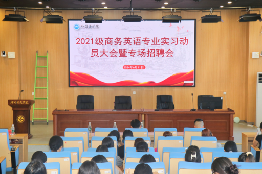 (通讯员 曾胜凤 摄影 李馨怡)6月11日下午15:30,外国语学院于博雅楼东三报告厅举办了2021级商务英语专业实习动员大会暨专场招聘会。会议由实习带队老师欧阳超群主持,外国语学院副院长胡维、商务英语系系主任潘缌缌、深圳513教育集团总监周晓峰、深圳万企千校网络科技有限公司人事总监李松、实习带队老师刘川、实习带队老师刘阳出席此次活动。2021级商务英语专业全体同学参加本次活动。