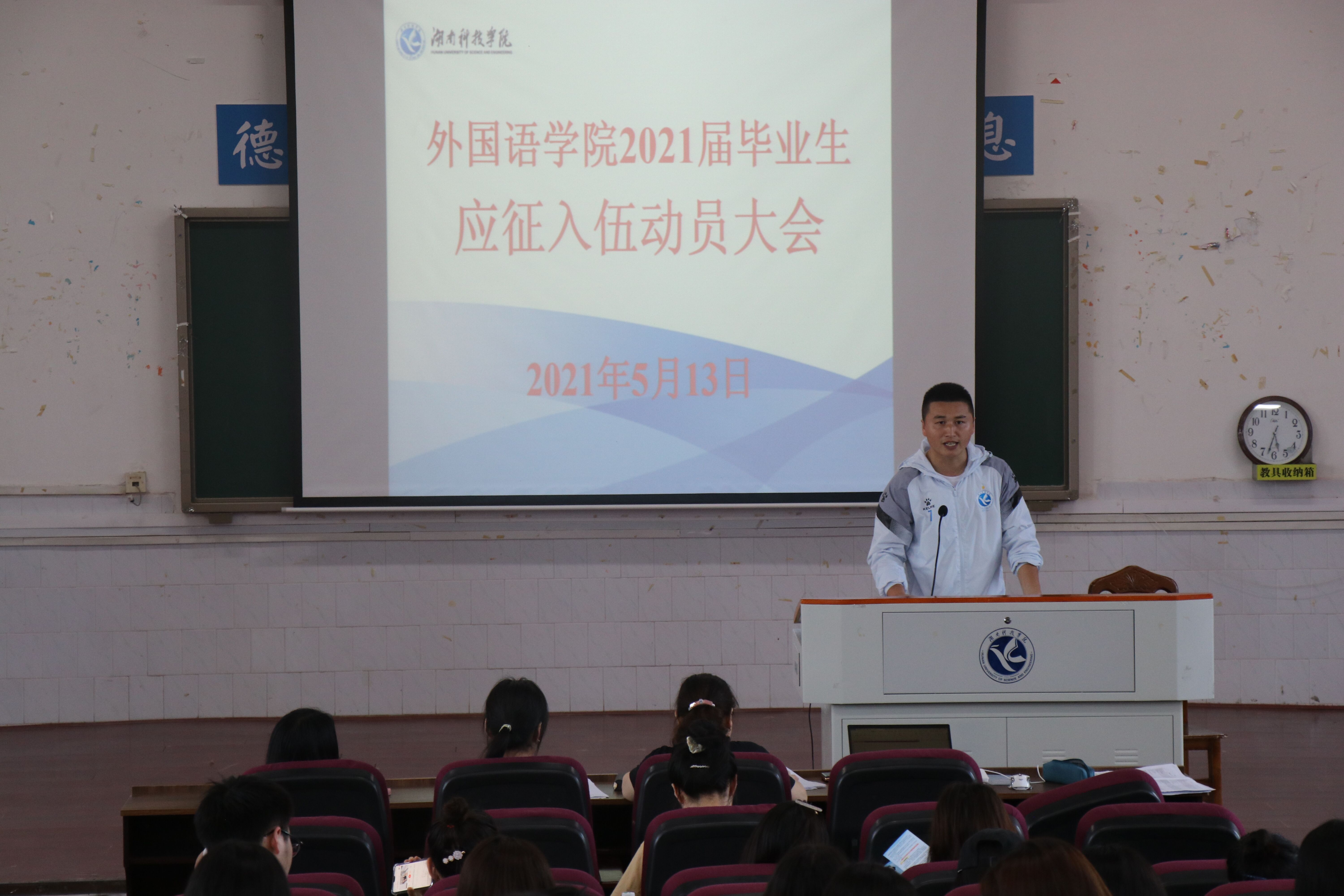 本网讯(通讯员 黄子幸)5月13日下午4:30,外国语学院于博雅楼东三召开2021届毕业生心理普查暨入伍动员大会。党总支书记张剑、2017级辅导员刘罗、商英1701班班主任郭旭明、英师1704班班主任章琴以及2017级在校学生到场与会。