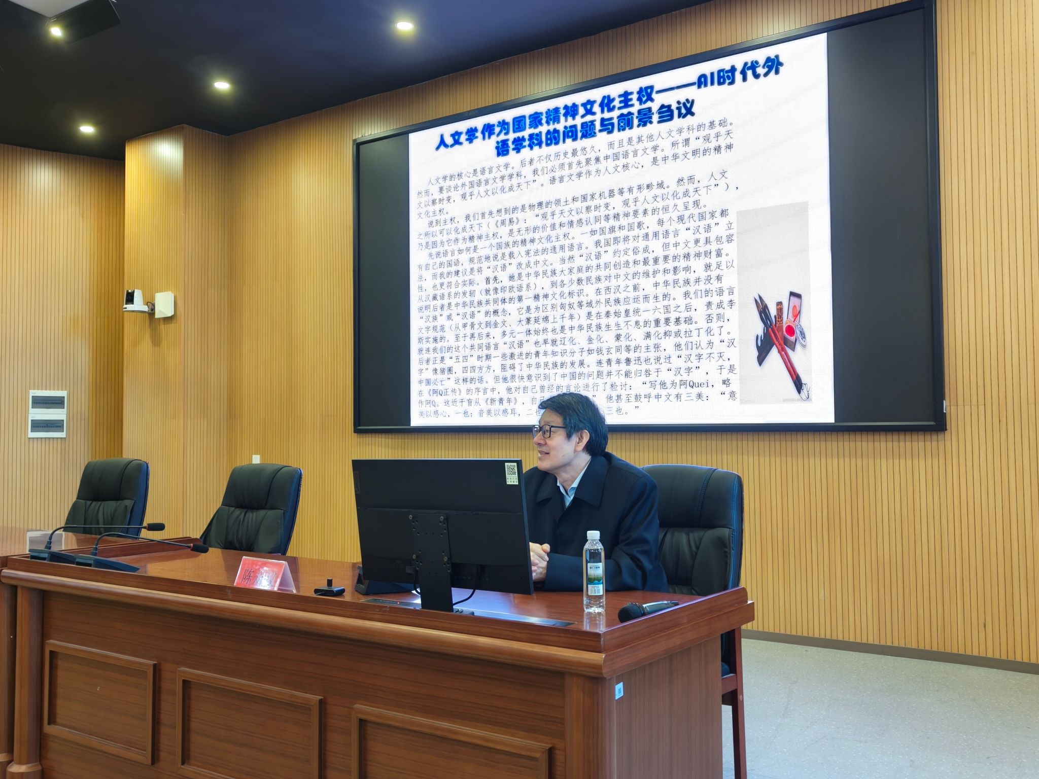 本网讯(通讯员 王薇)11月22日上午,湖南师范大学“潇湘学者”特聘教授,中国当代批评家,作家,翻译家,中国社会科学院学部委员陈众议教授,应邀为外院全体师生作题为“AI时代外语学科的问题与前景刍议”学术讲座。此次讲座由304am永利集团官网副校长郑银芳教授主持,外国语学院院长何丽萍教授,国交处处长刘堃教授等受邀出席,外国语学院全体教师、文法学院部分老师积极参与。