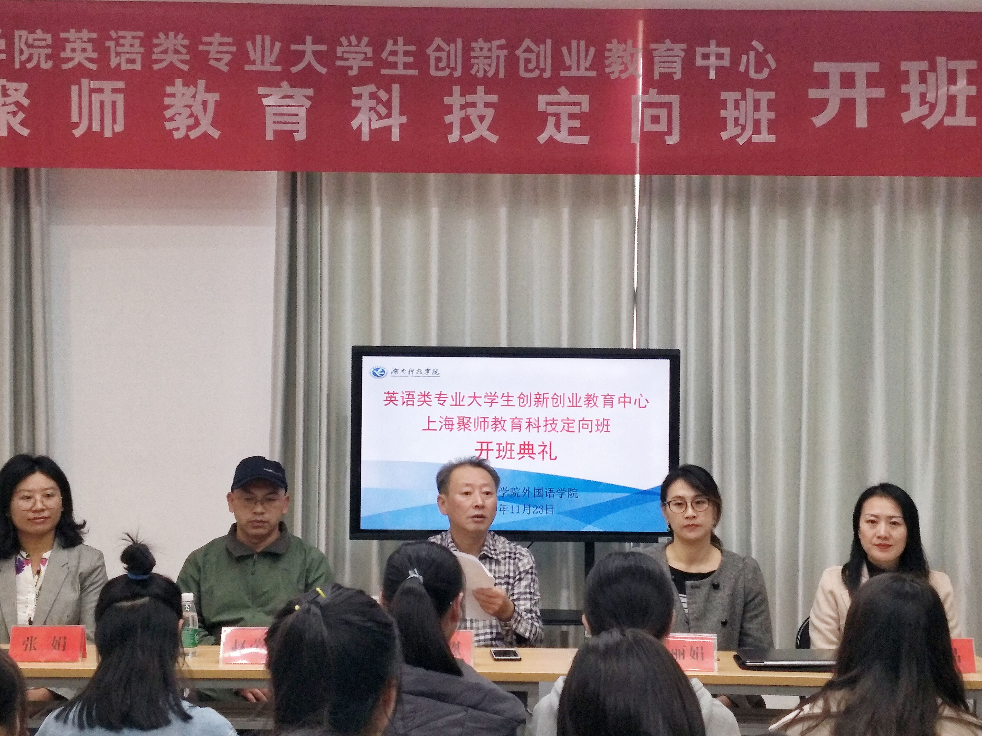本网讯(通讯员:王梦渲)11月23日下午,304am永利集团官网英语类专业大学生创新创业教育中心上海聚师教育科技定向班开班典礼在学校创新创业大楼317“聚师堂”校企合作工作室举行。出席本次活动的有上海聚师教育科技有限公司联合创始人谢丽娟、上海聚师教育科技有限公司培训经理张娟、外国语学院院长欧华恩教授和就业创业指导中心副主任赵荣。开班典礼由外国语学院党总支副书记罗晶主持,上海聚师教育科技定向班第一期42名学员共同参加此次开班典礼。
