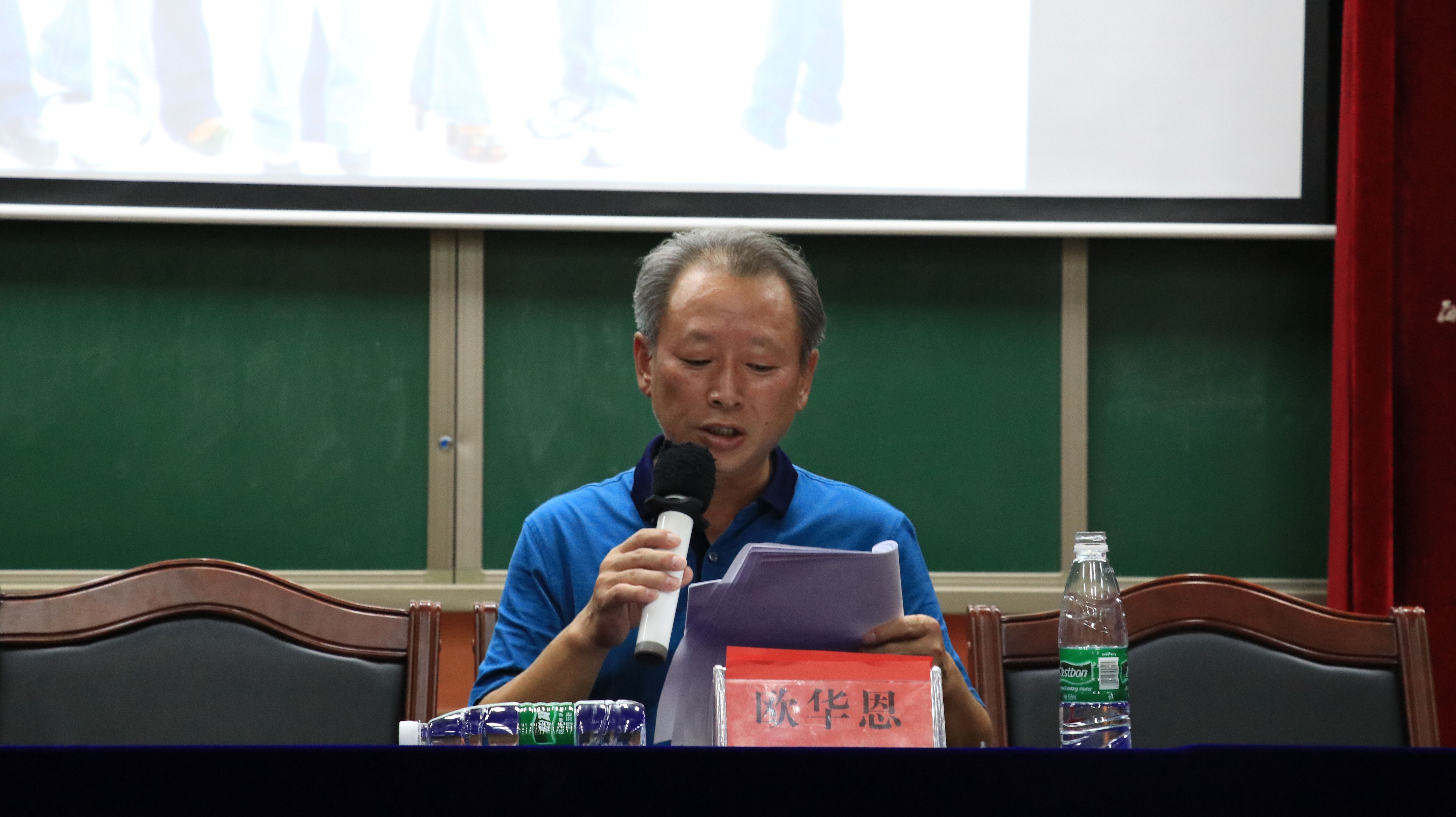 大会第一项:全体起立,奏唱国歌。接着,会议在简短的介绍后进入正题。首先,胡维老师做英语专业(英语师范、商务英语)介绍。她向新生介绍了外国语学院“以证促学、以赛促学、以研促学”的办学特色。她期望每个同学都能在外国语学院的培育下长大成人,蜕变成蝶。黄警慧老师从什么是日语,日语怎么学,学了日语能干什么等方面向新生介绍了日语专业。接着,欧华恩做新生寄语和学院情况介绍。欧院长从大学能给你什么、新同学如何适应大学、如何做大学学子以及大学生要早日定下日后目标等方面表达了他对新生的殷切期望。他希望大家都能掌握人生的真谛,会通中外,不负青春,不负韶华,不负阳光,不负诗与远方。大会最后一项,全体起立,奏唱校歌。