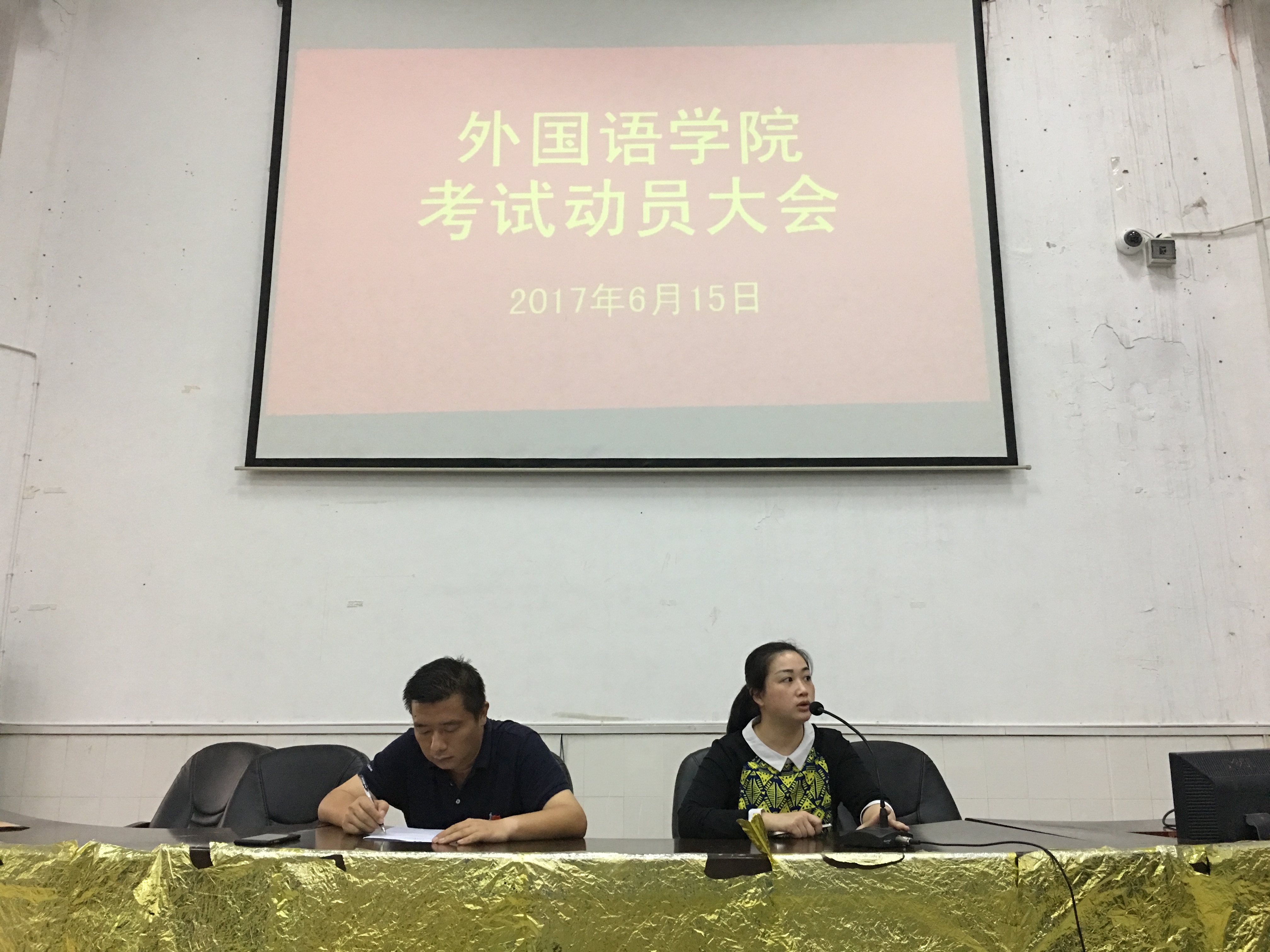 本网讯(通讯员 陈金萍 涂明珠)临近期末考试,为进一步严肃考风考纪,创建良好的考试环境,营造良好的学习氛围,6月15日中午,外国语学院在日新楼212举行考试动员大会。出席本次会议的有外国语学院党总支副书记王瑛、学工办主任胡赟、各年级辅导员以及学院全体学生。会议由胡赟主持。