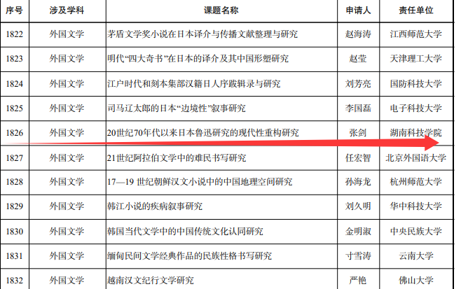 其中,我院日语专业张剑教授的《20世纪70年代以来日本鲁迅研究的现代性重构研究》获得外国文学类立项,这也是张剑教授第二次获得国家社科基金项目立项。至此,日语专业教师近年国家社科基金立项数量达到了4项,居湖南省高校日语专业前列。
