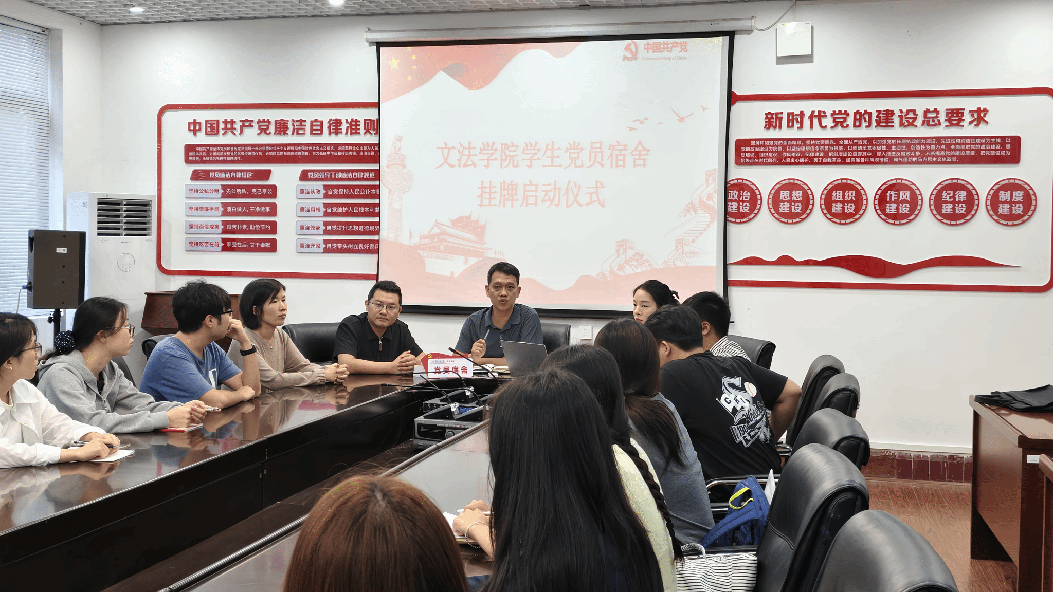 为强化学生党员身份意识与责任担当,深入推进学生党建与社区服务融合,充分发挥学生党员在生活园区的先锋模范作用,10月17日上午,文法学院学生党支部在学院党员活动室举行学生党员宿舍挂牌启动仪式。学院党总支副书记欧阳智超、各党支部书记、全体辅导员及学生党支部全体党员参加活动。
