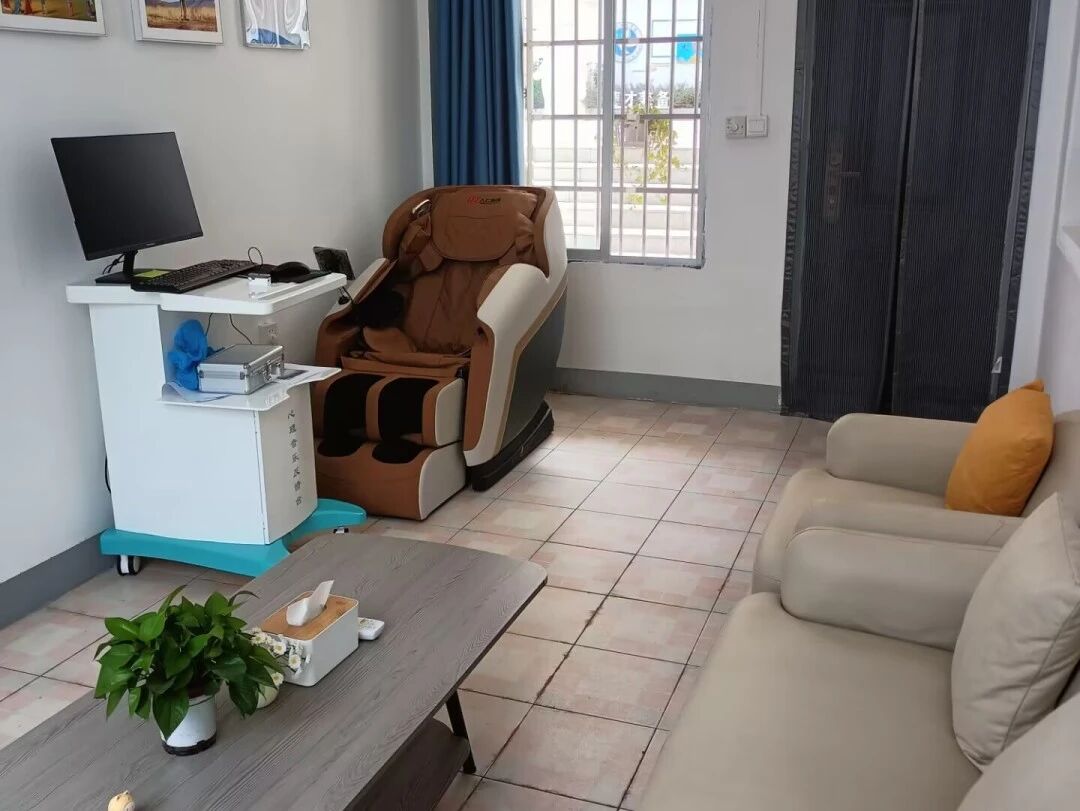 接待室内有休息椅,茶水和心理期刊。是日常接待来访学生、预约登记、填写相关材料、接听热线电话的心理第一站。