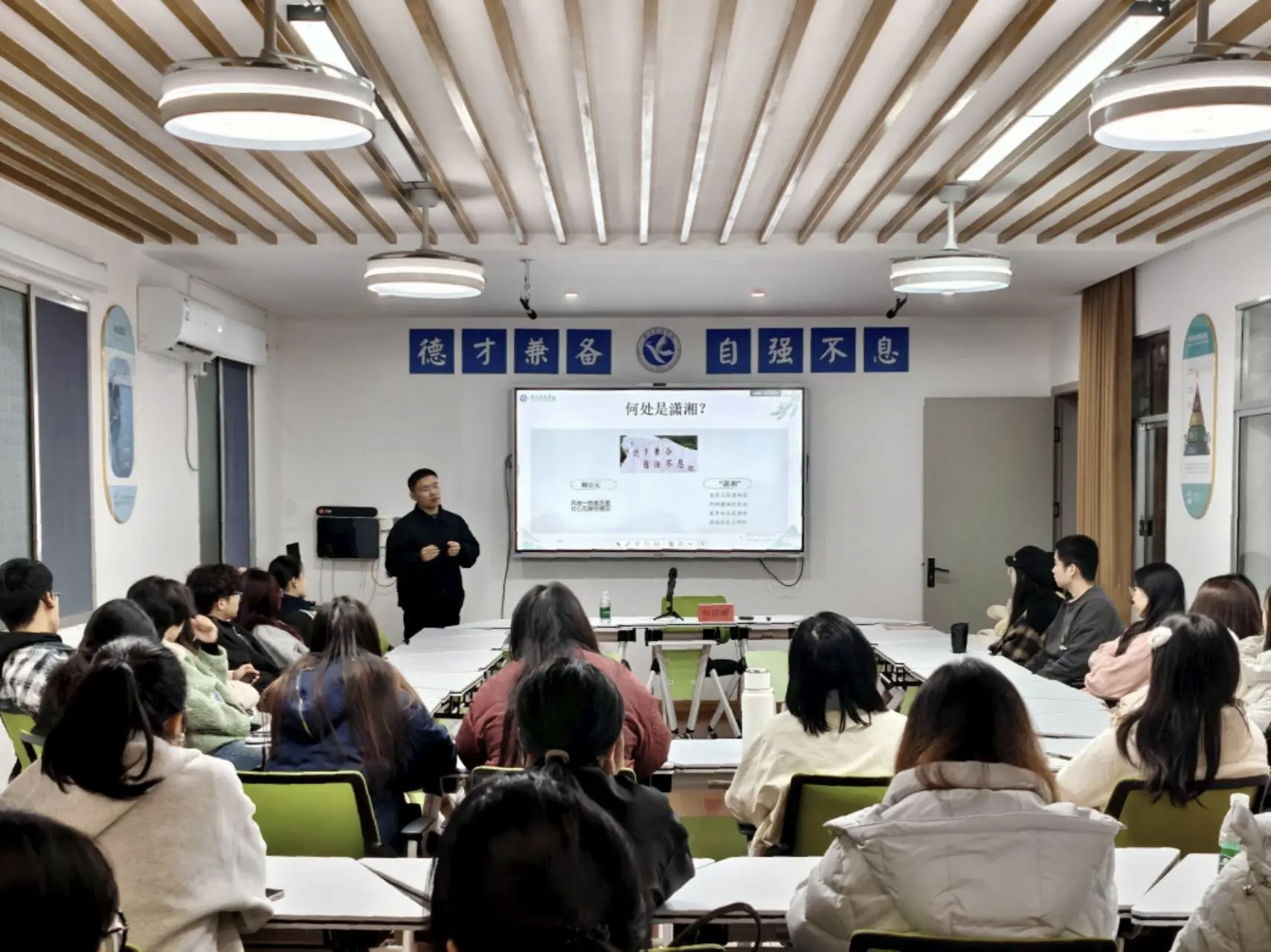 活动分为主题分享、互动交流与合照留念等环节。向薛峰以复旦大学陆建德教授的视频片段为引,从“生命意义感”的建构出发,引导学生思考自我价值与精神归宿,并启发学生从源远流长的潇湘文化中寻求心灵慰藉,在永州深厚的历史底蕴里完成从“小我”到“大我”的格局跃升。