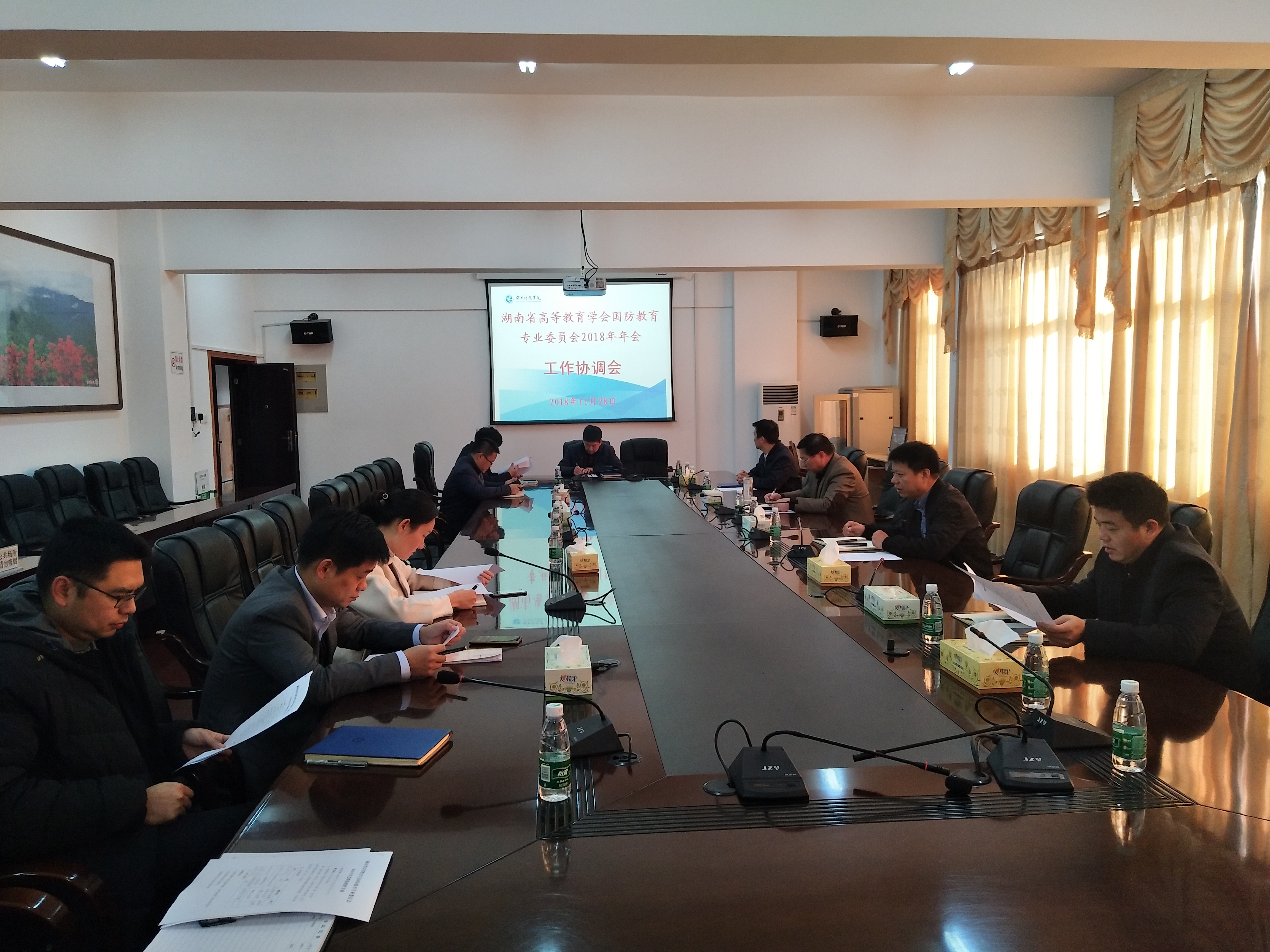 (简讯)2018年11月28日上午,学校召开湖南省高等教育学会国防教育专业委员会2018年年会工作协调会,会议由副校长程智开主持,学工部武装部、党政办、宣传部、计财处、后勤、保卫处、团委等相关部门负责人参加。