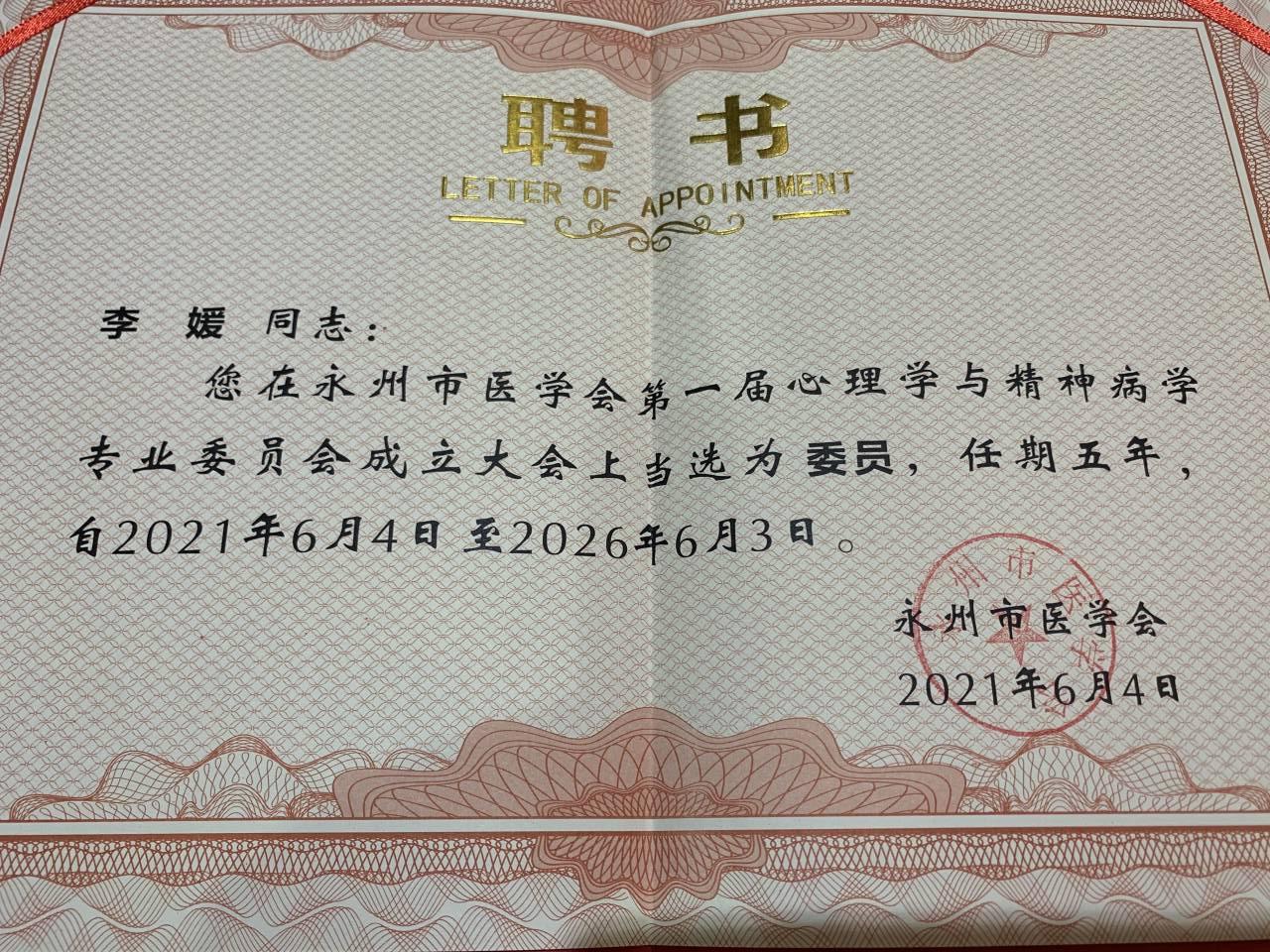 2021年6月5日,永州市医学会心理学与精神病学专业委员会和永州市精神卫生医联体成立大会暨学术交流会开幕式在永州召开,会议选举永利官网心理中心涂巍老师为常务委员、专职李媛老师和兼职咨询师申雯老师为委员。