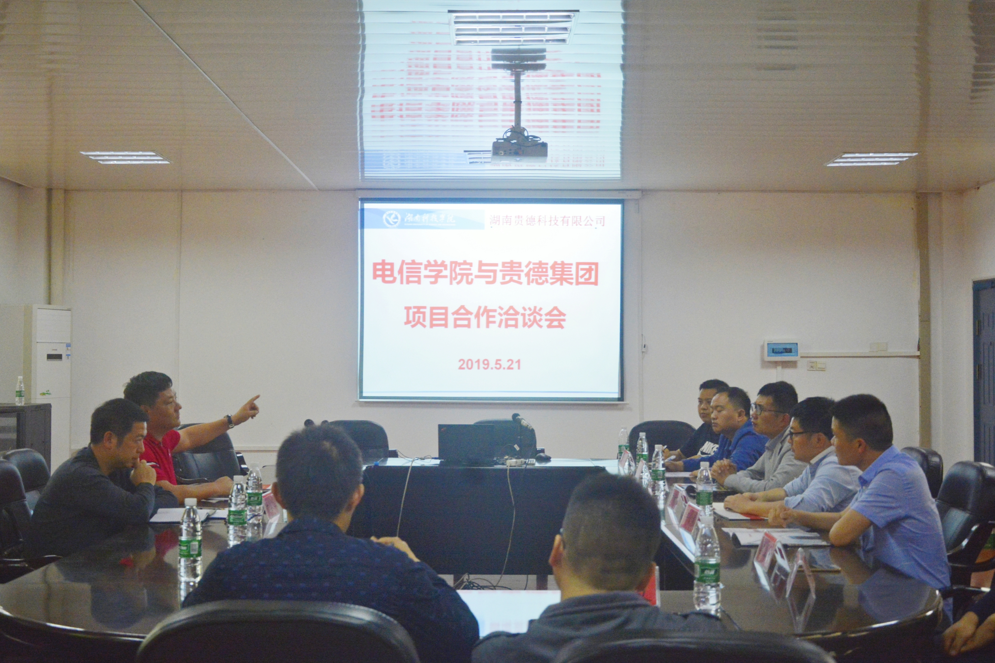 5月21日下午,我院特邀贵德集团董事胡军辉及江华县高新区副局长许宏程于知行楼106开展项目合作洽谈会,院长尹向东、副院长罗恩韬及李小武到场,相关教师到会参与。