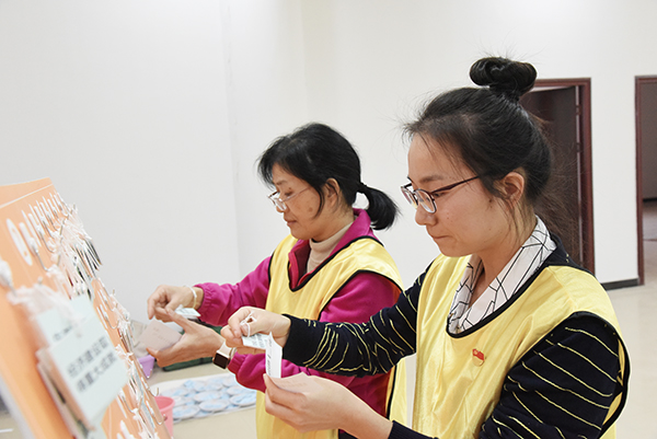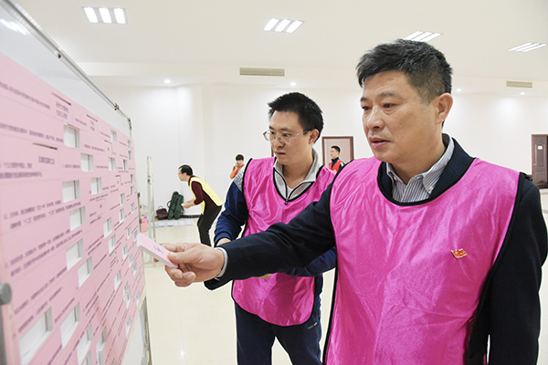 “填空格”环节采用知识接力赛的形式将每组成员排成2列纵队,以接力的形式依次进行。每次2名同志同时出发,在盆子里取一块答案条块,放入前方题板的相应空格内。答完题的成员与下一位同志击掌后站到队伍的后面,开始下一轮。此项活动的目的是检验党员同志学习党的十九大报告的成效。“挂方块”环节,每组派2名同志到前方盘子中选择一道题,并选择答案方块。通过该环节,既培养了团队协作精神,又进一步增强了广大参与同志学习贯彻十九大精神的热情。“关键词”环节,小组成员根据抽签问题,集体讨论,总结答案要点,并概括出关键词,然后全组成员共同用大毛笔书写关键词。