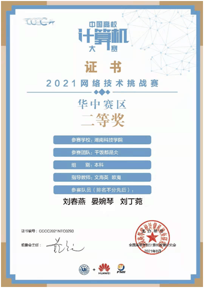 本网讯(通讯员 刘毅 郭靖)日前, 2021年“中国高校计算机大赛-网络技术挑战赛”决赛答辩评审在温州大学举行,来自全国的268件作品分别在五大赛道展开紧张激烈的角逐。我院由文海英、欧嵬老师指导的刘春燕团队的作品获华中赛区二等奖,并在全国决赛中获得三等奖。