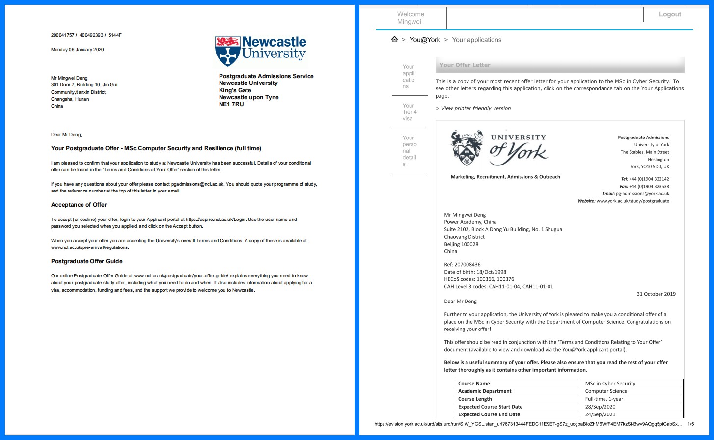 本网讯 近日,永利官网电子与信息工程学院软件1601班的邓铭巍同学同时收到了来自英国约克大学和纽卡斯尔大学的研究生录取通知书。
